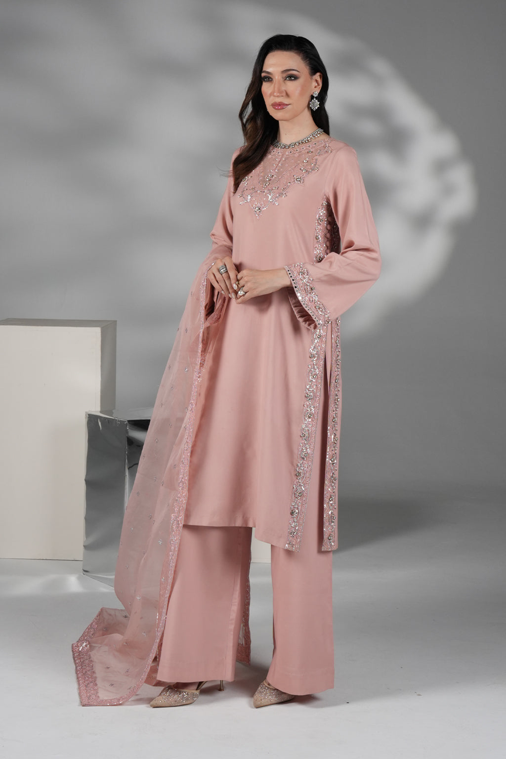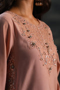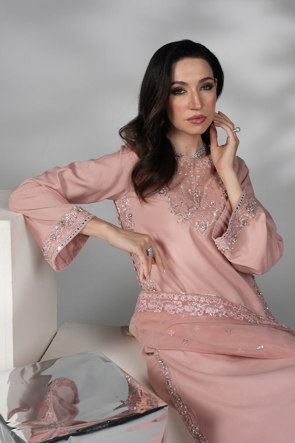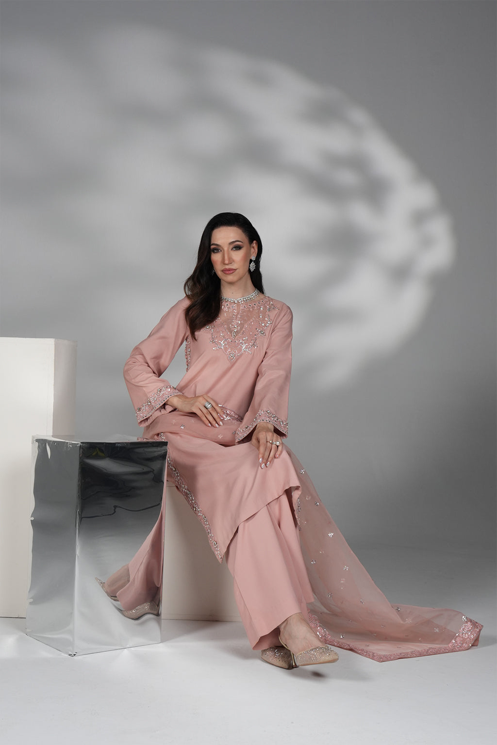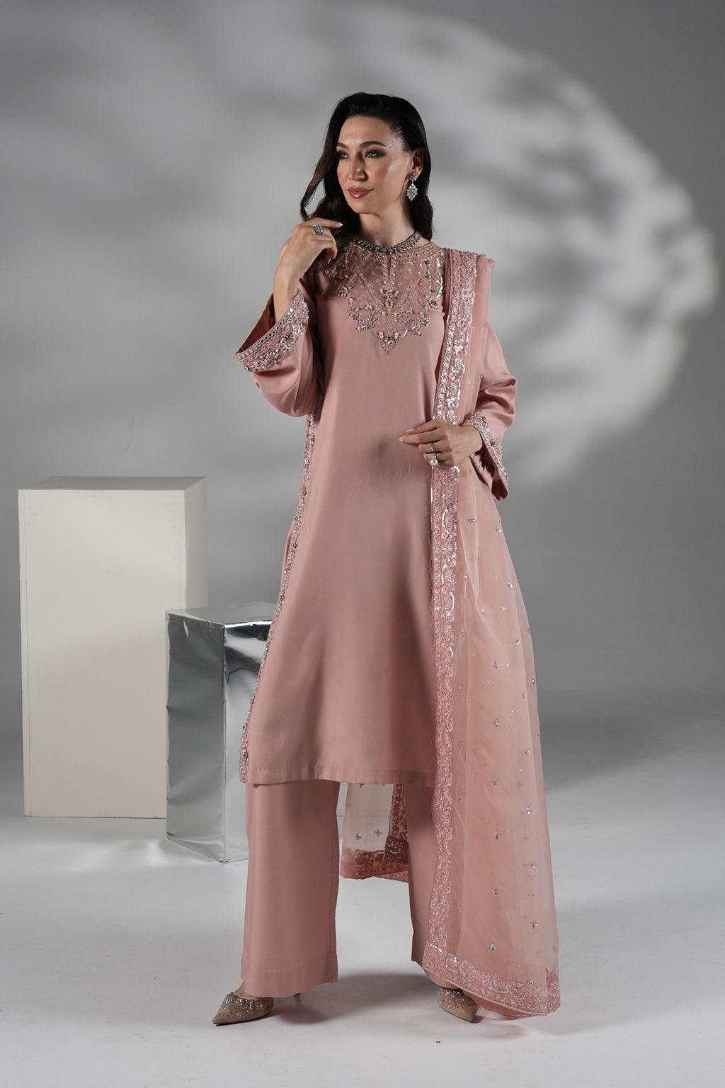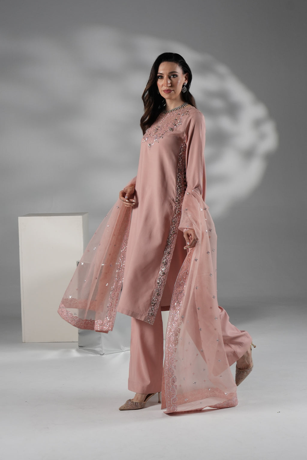 Elegant rose gold ensemble featuring hand embroidery on shirt & shalwar, finished with a chiffon dupatta and hangings.
