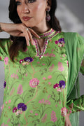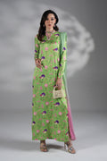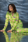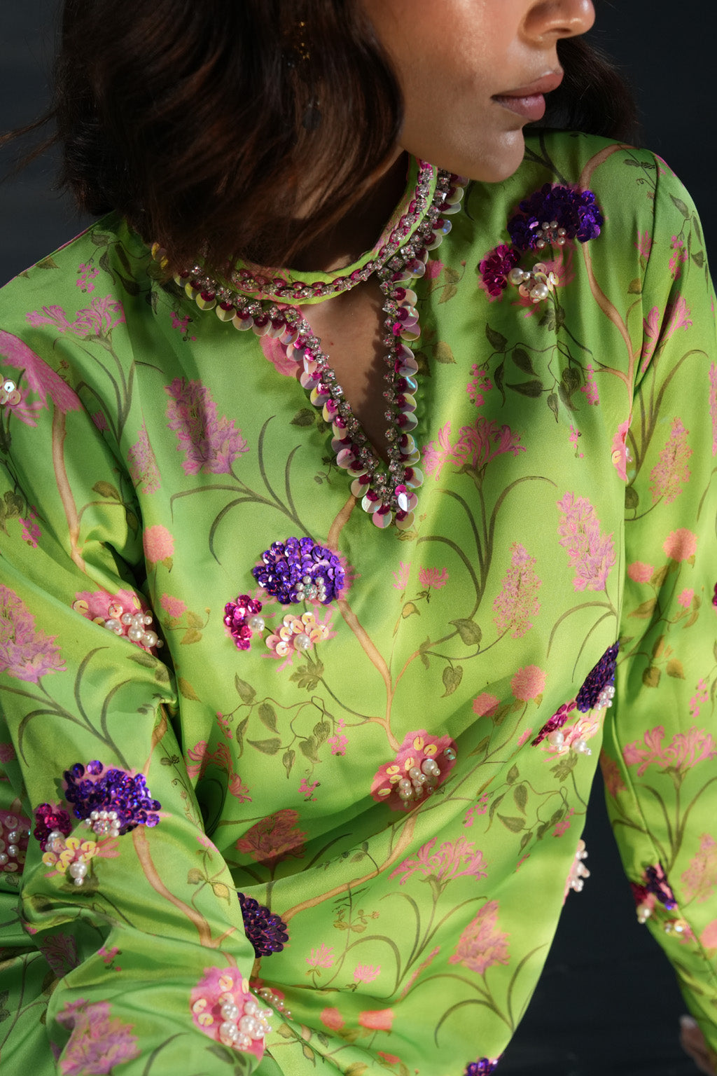Vibrant printed green charmeuse ensemble with handwork detailing on shirt and matching trouser.