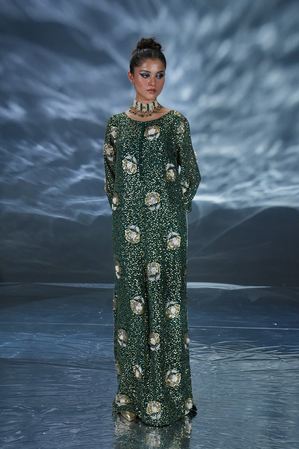 Shirt: Bottle green chiffon shirt with intricate embroidery and delicate hand embellishments