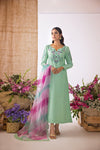 Sage Green Rawsilk long shirt with silk thread embroidered neckline and sleeves paired with straight viscose silk pants. Complete the look with diagonal dyed organza dupatta finished with lace edging.