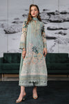 A captivating green printed A-line shirt with delicate hints of yellow, adorned with exquisite embroidered organza borders and lace detailing. Paired with a luxurious silk dupatta and Izaar pants, both featuring elegant lace borders, this ensemble effortlessly blends modern sophistication with timeless charm.