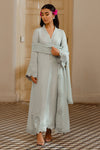 Elevate your style with our Mint green long shirt adorned with resham embroidery and 3D organza flowers, paired with straight pants and a schiffli dupatta for a complete look.
