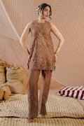 A mocha khaddi silk cord set with a halter neckline paired with a cutwork crew detail, combining contemporary style with intricate craftsmanship. The bootcut pants are adorned with Schiffli embroidery, cutwork, and applique work, adding texture and subtle contrast to the sleek silhouette.