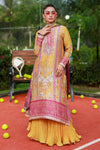 A stunning gold mustard raw silk long A-line shirt, featuring a kurta patti neckline with button detailing and fitted sleeves for a sleek silhouette. Paired with a medium silk crushed Dhaka adorned with gota work, roti, and sequins, this ensemble radiates festive charm and timeless elegance. .