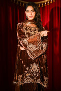 This mocha velvet ensemble exudes understated luxury with intricate zari applique adorned in fine zardozi handwork. It is paired with a complementing shalwar featuring gold spray sequins that add a soft shimmer. The organza dupatta, finished with velvet applique and delicate gota details, completes the look with a perfect balance of elegance and tradition.