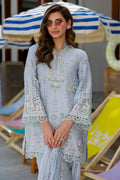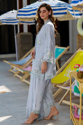 A periwinkle raw silk short shirt paired with a shalwar, adorned with delicate pastel resham embroidery and intricate cutwork across the sleeves and daaman. The raw silk narrow shalwar feature matching cutwork detailing, complemented by a schiffli silk dupatta finished with cutwork along all four borders.