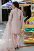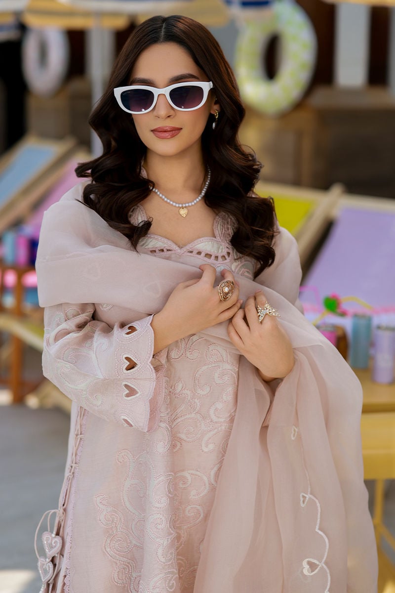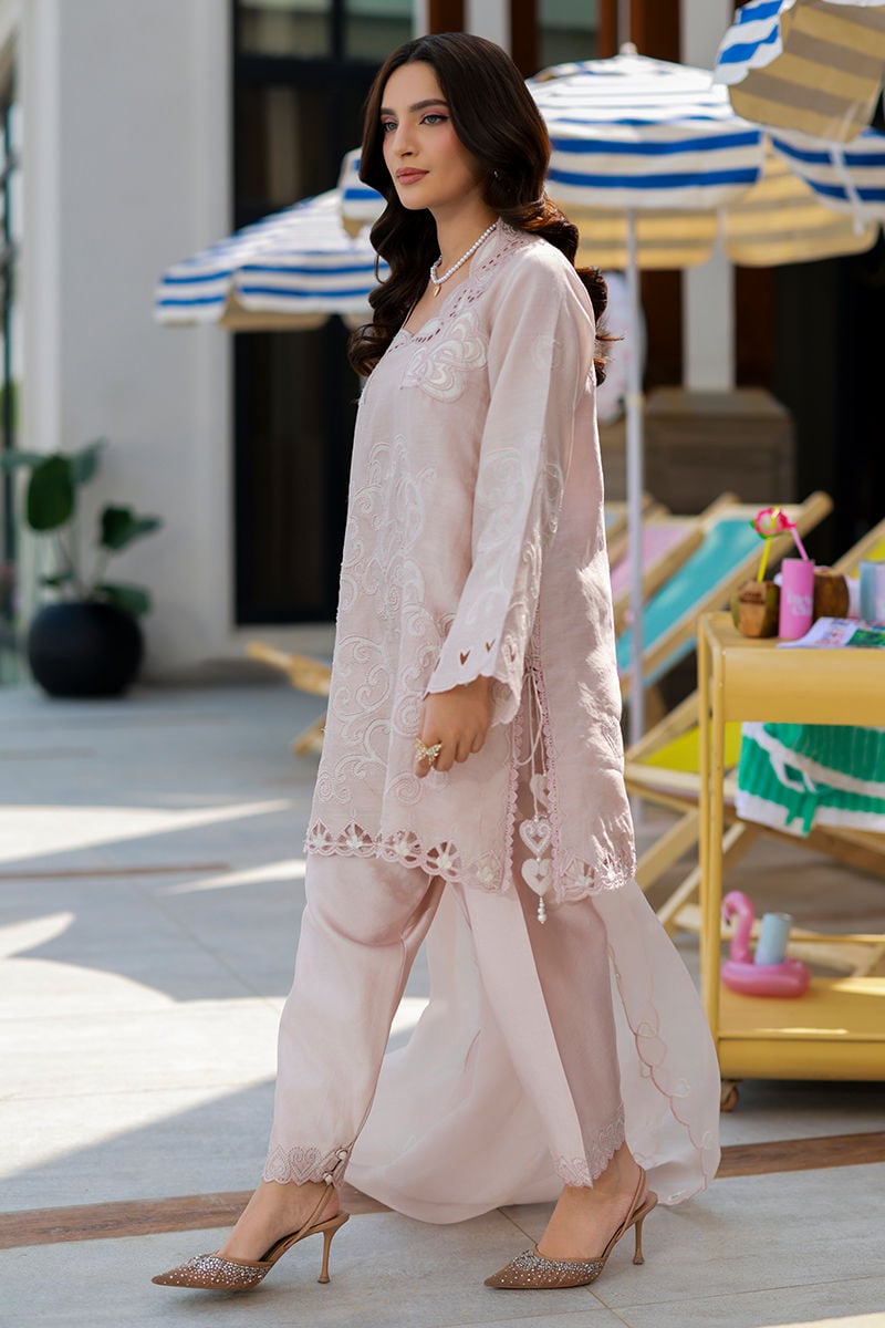 A pale pink khaddi silk short shirt with ivory sheesha silk appliqué and cutwork details, paired with narrow sheesha silk shalwar and a pure organza dupatta featuring delicate embroidery for a soft, elegant look.