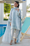 An ice blue sheesha silk short shirt unfolds as a play of pattern and precision, featuring asymmetric block prints across the kurta and sleeves, framed by a sculpted white wavy border along the daaman and cuffs. Intricate checkered cutwork and tilla patti detailing add depth and texture to the sleeves. Paired with a white sheesha silk shalwar, accented with an oversized checkered block print and finished with an ice blue wavy hem, the look is completed with a medium silk dupatta marked by white asymmetric block prints an editorial expression of modern craft and quiet statement dressing.