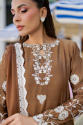 A mocha kalidaar khaddi silk shirt with fitted sleeves, adorned with ivory appliqués and lace, paired with a crushed dhaka and a medium silk dupatta featuring matching appliqué and a white izaar with block print detailing for a refined, elegant look.