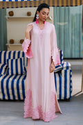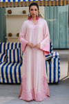 A pink raw silk kaftan adorned with delicate sheesha silk appliqués for a simple yet elegant look.