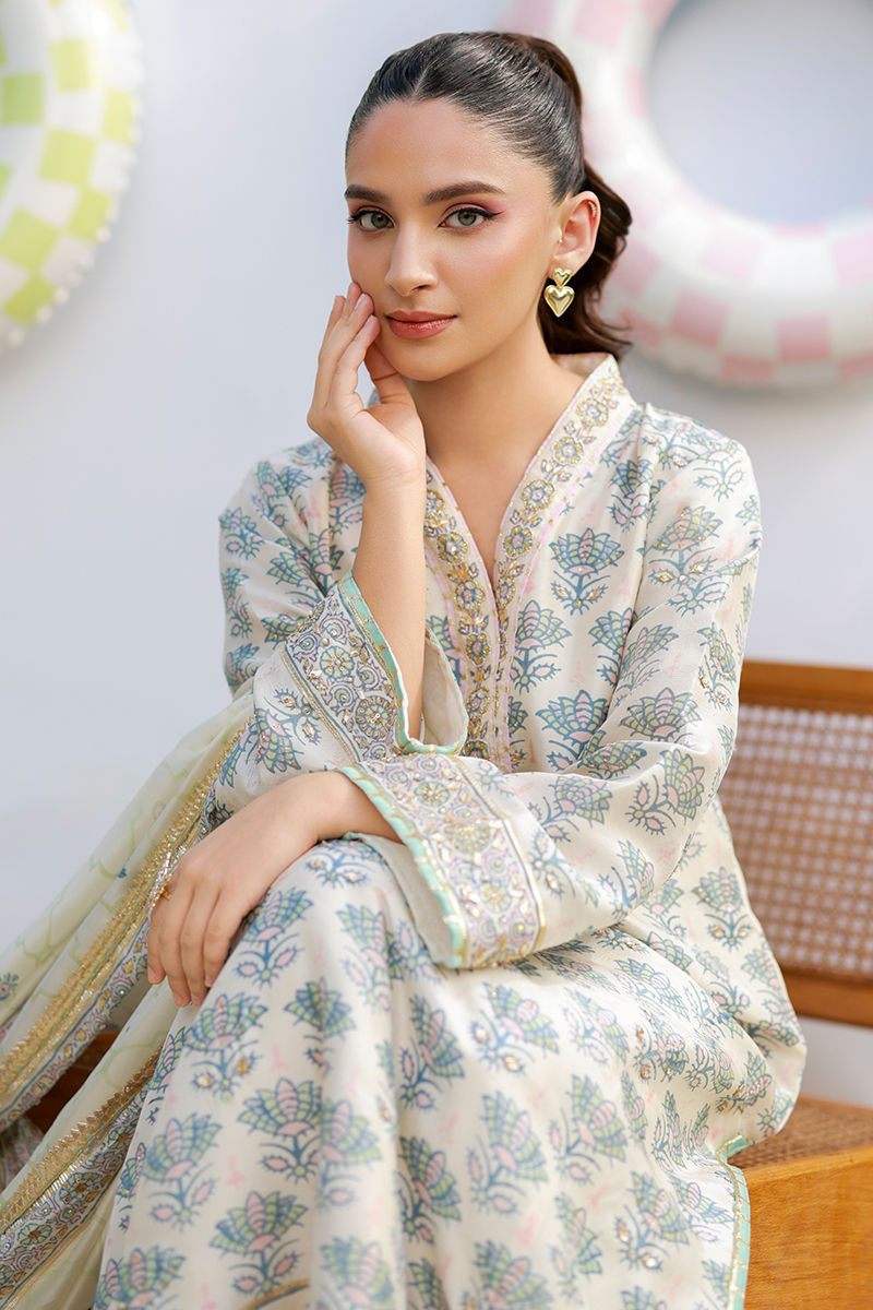 An ivory raw silk kurta featuring discharge work with delicate blue and pink accents, adorned with hand-embellished tila pati details. Paired with medium silk dupatta and pants with block print, creating a graceful and elegant ensemble.