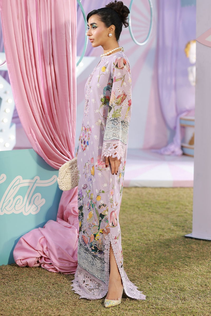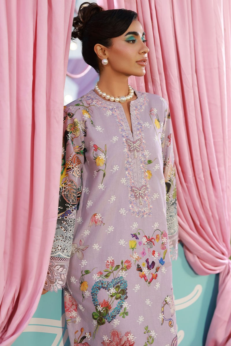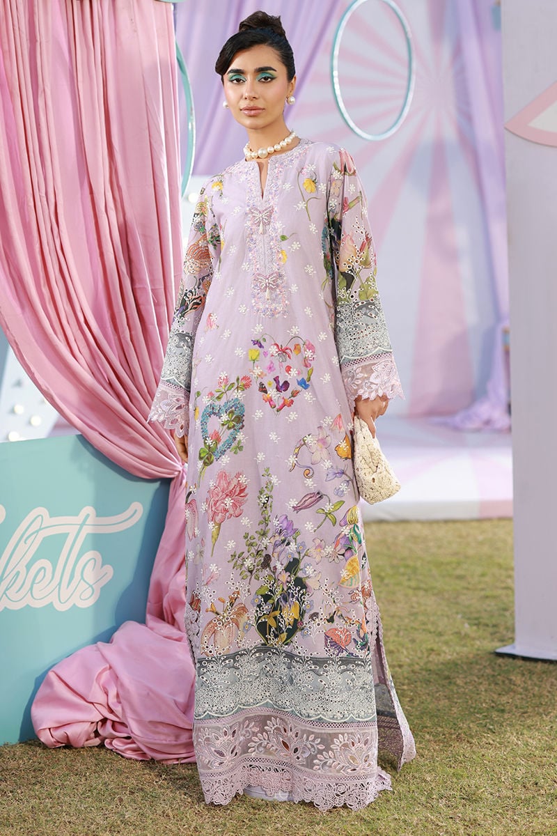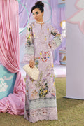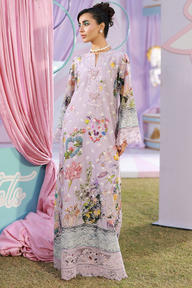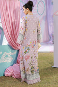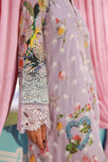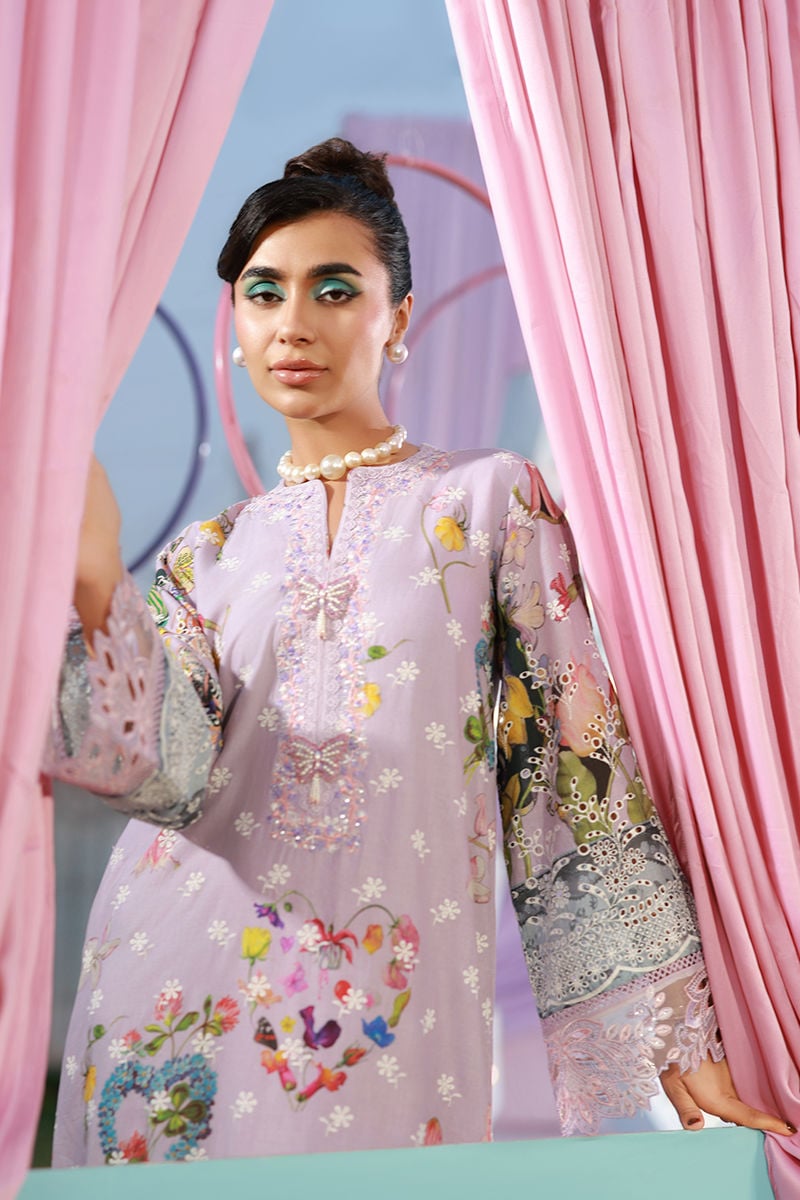 A lilac printed schiffli kaftan featuring elegant cutwork and lace detailing on the sleeves and hem, complemented by butterfly embellishments at the neckline. Comes with an attached lining for added comfort