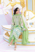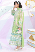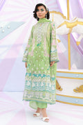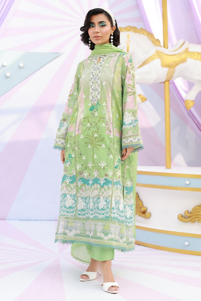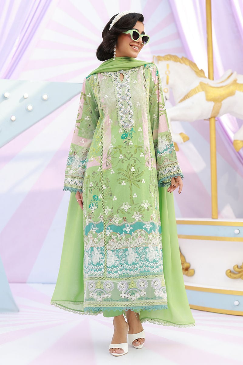 A Lime green schiffli kurta featuring a keyhole neckline adorned with delicate embroidery and embellished floral buttons. Finished with intricate lace and cutwork embroidery on the sleeves and hem, and paired with cotton pants and a medium silk dupatta with refined lace edging for an elegant ensemble.