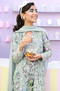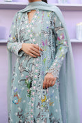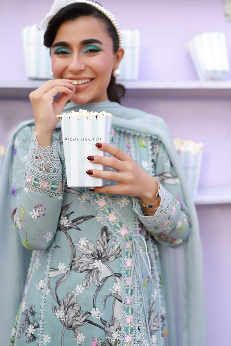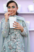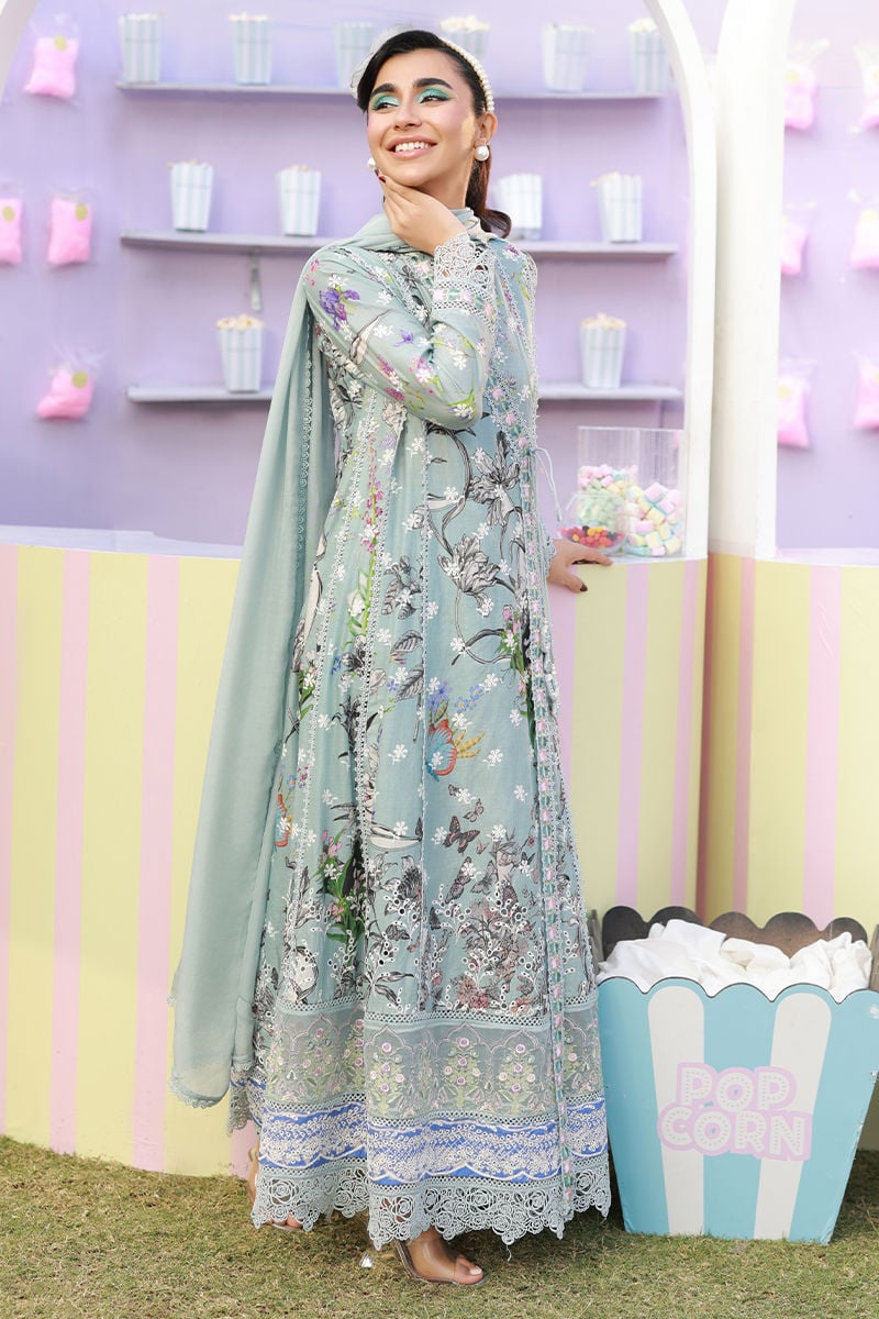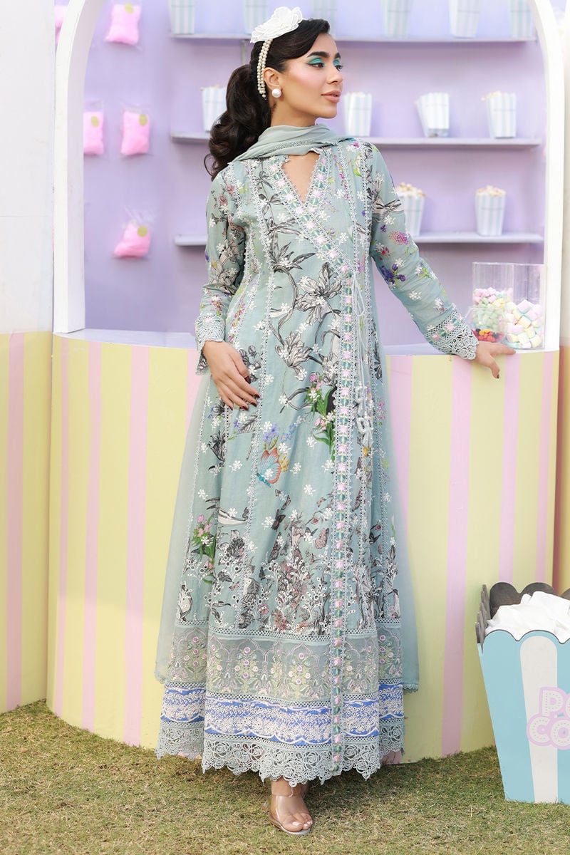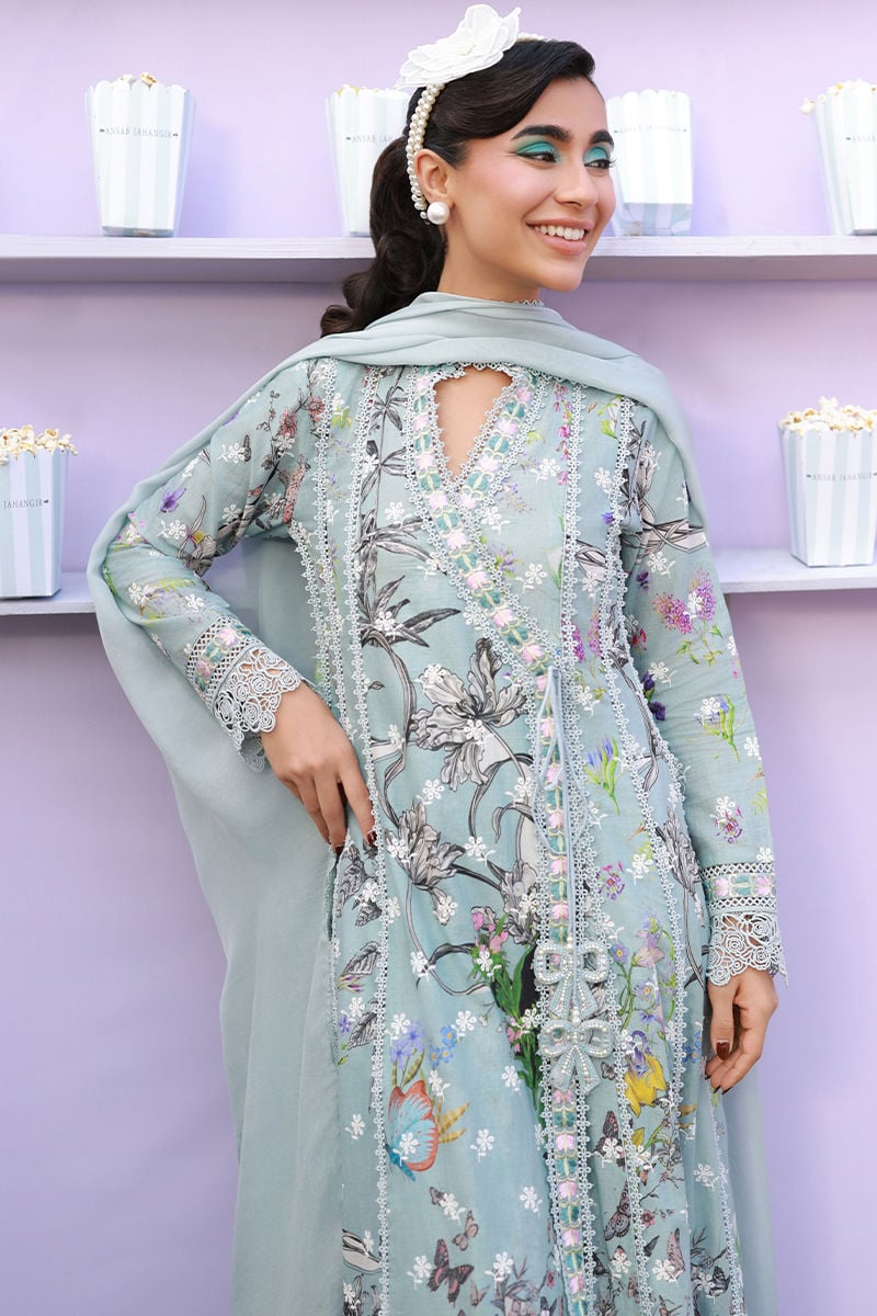 A Sage blue schiffli angarkha, intricately adorned with delicate embroidery and lace detailing throughout, and finished with charming embellished bow tassels. Paired with straight cotton pants and a medium silk dupatta with lace edging, creating an effortlessly elegant ensemble.