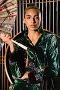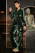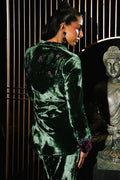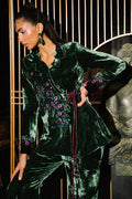 An exquisite emerald green velvet wrap top adorned with cherry blossom€“inspired embroidery, enriched with delicate hand embellishments featuring cutdana and sequins for a soft, lustrous shimmer. Subtle purple accents enhance the design, adding a refined pop of contrast, while the notch collar lends a tailored, contemporary touch. Paired with velvet boot-cut pants, this ensemble blends opulence with modern sophistication perfect for making a graceful yet striking style statement.