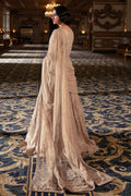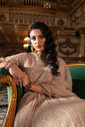 This lavishly embellished skin gold lehanga choli is heavily jeweled with embroidery, adda embellishments & sequin work on the bodice along with dangling hangings on the sleeves & scalloped borders. Each panel of the voluminous lehanga comprises intricate heavy embroideries & sequin details finished with lace & facing. The net dupatta is adorned with heavy spray of embroidery motifs with sequin details & heavy borders.