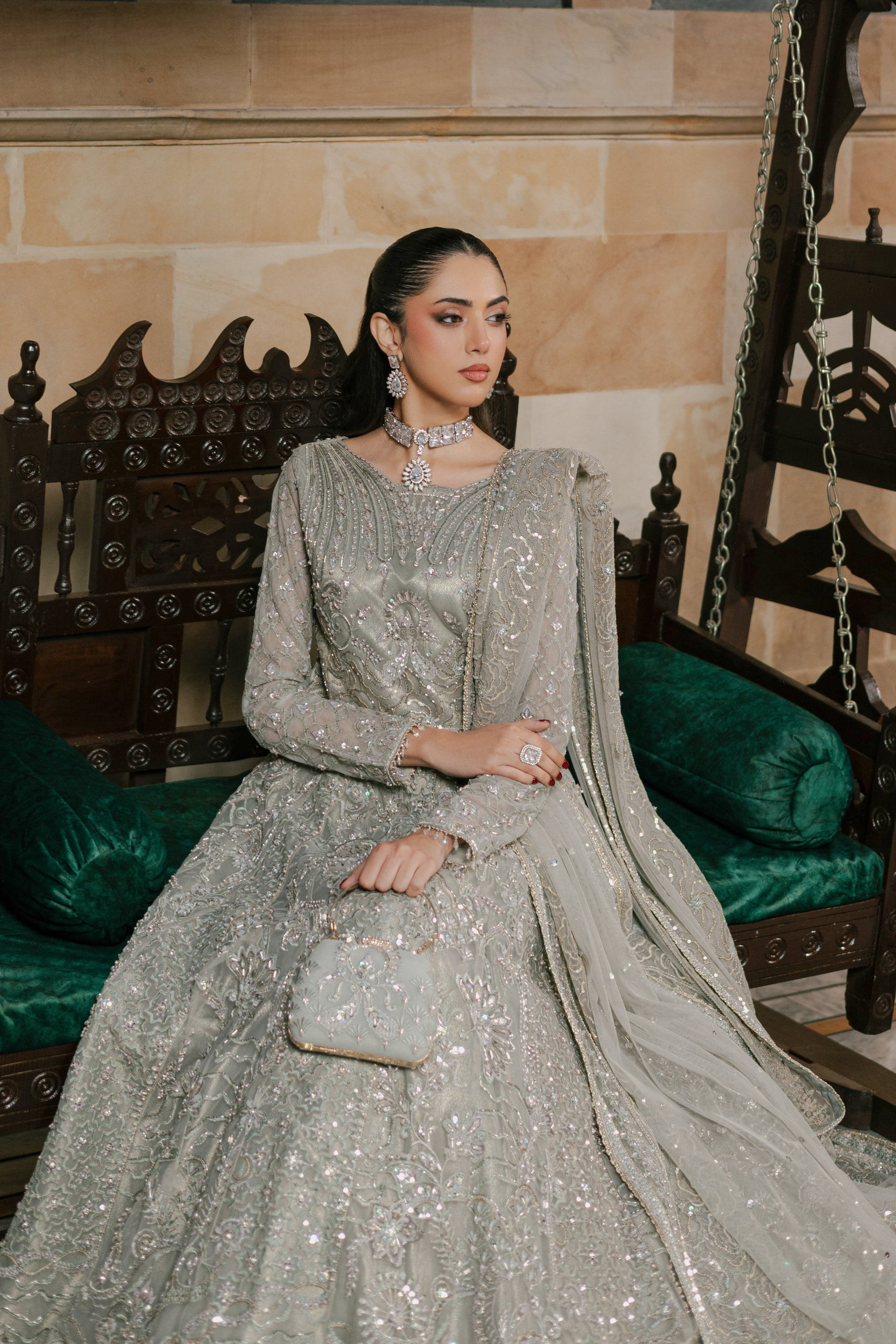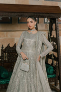 Talk about a princess dress! This silver-grey maxi frock is the epitome of grandeur and luxury, with its unique neckline & full sleeves, the frock is heavily adorned with hand embellishments comprising of stone work, pearls, crystal work & heavy sitari details along with thread embroidery and sequin work. The composed bodice is adorned with embellishments and abstract self-texture play. The sleeves are adorned with Islamic motifs inspired jaal with mini motifs ending with crystal hangings. The back of the bodice is also adorned with embellishment details. The frock itself is the blend of the mixture of textures, jaal embroidery work & heavy pearl embellishments with sitari work, finished with embroidered border & minimal lace. The dupatta is decorated with 4-sided embroidered border, textured floral motifs & sitari spread. Outfit comes with a matching hand embellished clutch & straight pants.