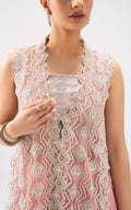 Grace meets serenity in the Blush Reverie Ensemble, a delicate celebration of understated luxury. Crafted in a flowing organza blush pink fabric, this long, A-line silhouette is adorned with hand-embroidered silver threadwork and subtle sequin accents that glimmer softly with every step. The deep-slit neckline is elevated with intricate embellishments, while the fluid layers beneath add volume and movement to the design. Finished with long sleeves and refined detailing at the hem and side panels, this ensemble is perfect for formal luncheons, festive gatherings, or intimate soirees. A timeless piece that speaks of poise, femininity, and quiet elegance.