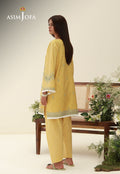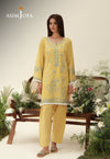 Sunlit and spirited, this yellow ensemble mirrors the warmth of a perfect summer afternoon. The front is illuminated with embroidery in refreshing contrasting tones, creating a soothing interplay against the vibrant base. Sleeves and hem are finished with refined thread fringe, adding texture and movement with every step. Paired with a striking shalwar, the ensemble captures the essence of effortless seasonal dressing with a distinctive flair.