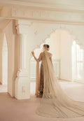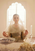 Mehek is a poetic symphony of elegance and ethereal charm for a bride's special day. The stunning look features a delicately crafted net pishwas with sheer net sleeves including geometrical and floral khaka surface that exude timeless art and romance. The embellished silk lehnga anchors the look, adorned with machine embroidery of resham and badla. The pishwas is hand embellished by shimmering crystals, bethki, tilla, pearls, crystals, dabka, sequins, kingri and cutdana.The details showcase artisan precision. The stunning net veil and minimal embroidered and embellished scalloped net dupatta with sparkling spray is radiating an emotion crafted for moments of magic.