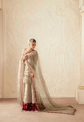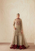 Zeenat is a vision of sheer sophistication and timeless allure. The ensemble features a see-through double layered pure organza shirt, paired with block printed maroon silk bustier, creating an enchanting interplay of texture and translucence. The silk sharara is adorned with patching details of block-printed deep maroon border. The attire includes craftsmanship of machine embroidery, sparkling badla and resham work, tilla, gotta,semi pure crystals, bethki, and fine bead detailingeach element curated to perfection. Pure organza dupatta with gotta spray and contrasting maroon border with badla embriodery completes the stunning look.