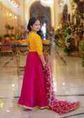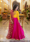 Make your little one shine with this vibrant yellow and shocking pink lehenga set, crafted from luxurious silk fabric and adorned with exquisite adda work. The look is completed with a delicate embroidered net dupatta, adding a touch of elegance and festive sparkle. Perfect for weddings, mehndi events, and special celebrations, this outfit beautifully blends traditional charm with youthful grace.