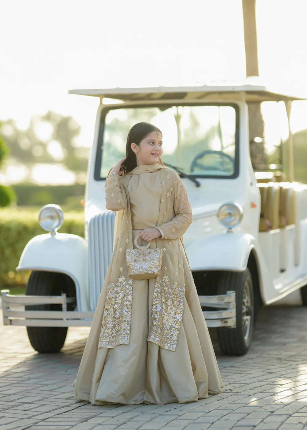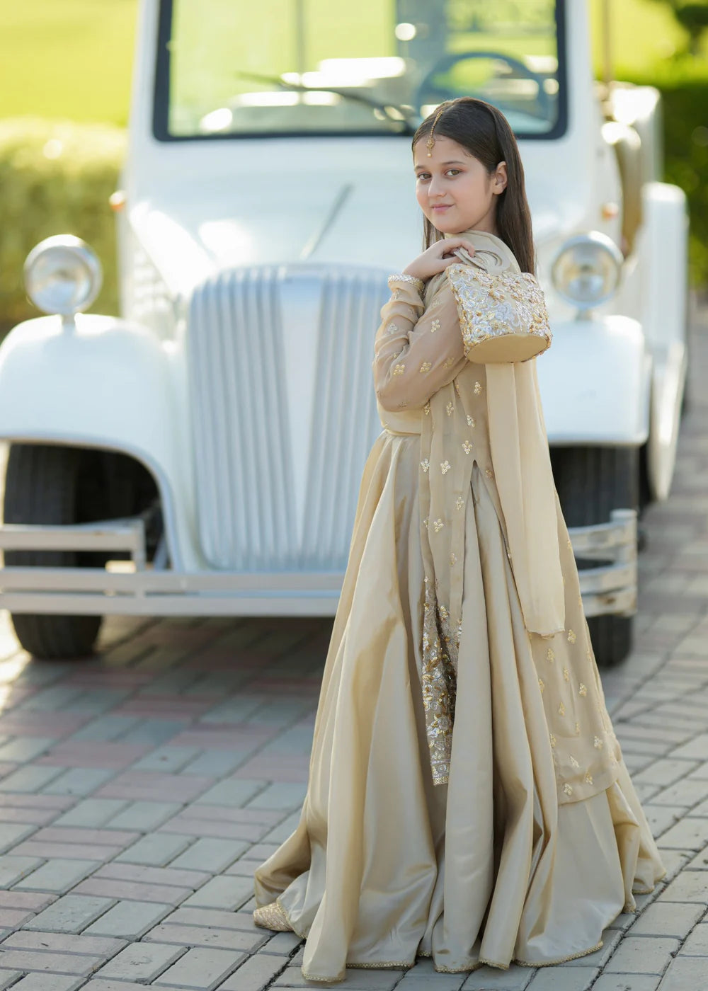 This exquisite Girl's Gown Lehenga in Beige is a stunning choice for formal events. Crafted from luxurious Silk fabrics, it features intricate embroidery work and a multi-layers Lehenga design. The ensemble includes a Top, Bottom, Dupatta, and a gown for a complete look that exudes elegance. Elevate her style with Fairy Queen.
