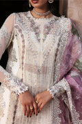 A luminous ivory ensemble elevated with delicate silver and pastel embroidery, this look blends softness with quiet refinement. The long silhouette features sheer sleeves and intricate panel work that add lightness while keeping the structure intact. Subtle floral detailing at the neckline brings a hint of color, echoed beautifully in the lilac organza dupatta draped over the shoulder — its painterly blooms and scalloped edging adding a romantic, fluid touch.