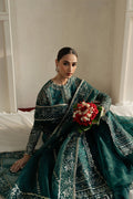 This regal emerald green ensemble is a masterpiece of timeless elegance, crafted on delicate net fabric and intricately adorned with silver and gold embroidery that shimmers with opulent charm. The structured front-open silhouette flows gracefully into a flared hemline, while the sheer embroidered sleeves enhance its ethereal sophistication. Paired with a coordinating dupatta finished with ornate embellishments, this ensemble is perfect for weddings and grand festive occasions.
