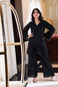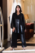 Introducing Raven Glow €“ a stunning black two-piece crafted from luxurious raw silk. With its sleek, modern design and flowing culottes, this Diva outfit exudes both sophistication and comfort, making it a perfect choice for any occasion.