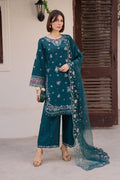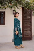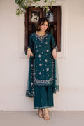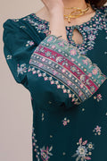 This Eid lawn ensemble features an ocean green shirt designed with an embroidered keyhole neckline and an embroidered spread across the front. The hem is finished with lace, while the wide sleeves are detailed with embroidery and scalloped organza hems, finished with delicate bead hangings for a festive accent.
