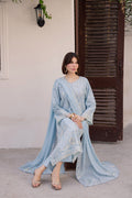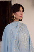 This Eid lawn ensemble features a fully embroidered pima shirt with detailed embroidery across the front, finished with embroidered organza motifs and borders that add definition to the design.