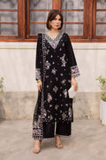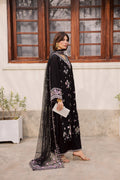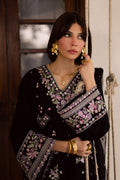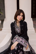 This Eid lawn set features a black three paneled long shirt with a composed embroidered V neckline and an embroidered spread across the panels. Pearl detailing is delicately added, enhancing the festive feel without overwhelming the design.The shirt is paired with flared long sleeves detailed with embroidered borders and bowring, finished with pearl hangings.