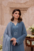 This teal grey festive set features a long georgette shirt with a round hem, highlighted by a badla embroidered neckline and an embroidered hem for subtle festive detailing.