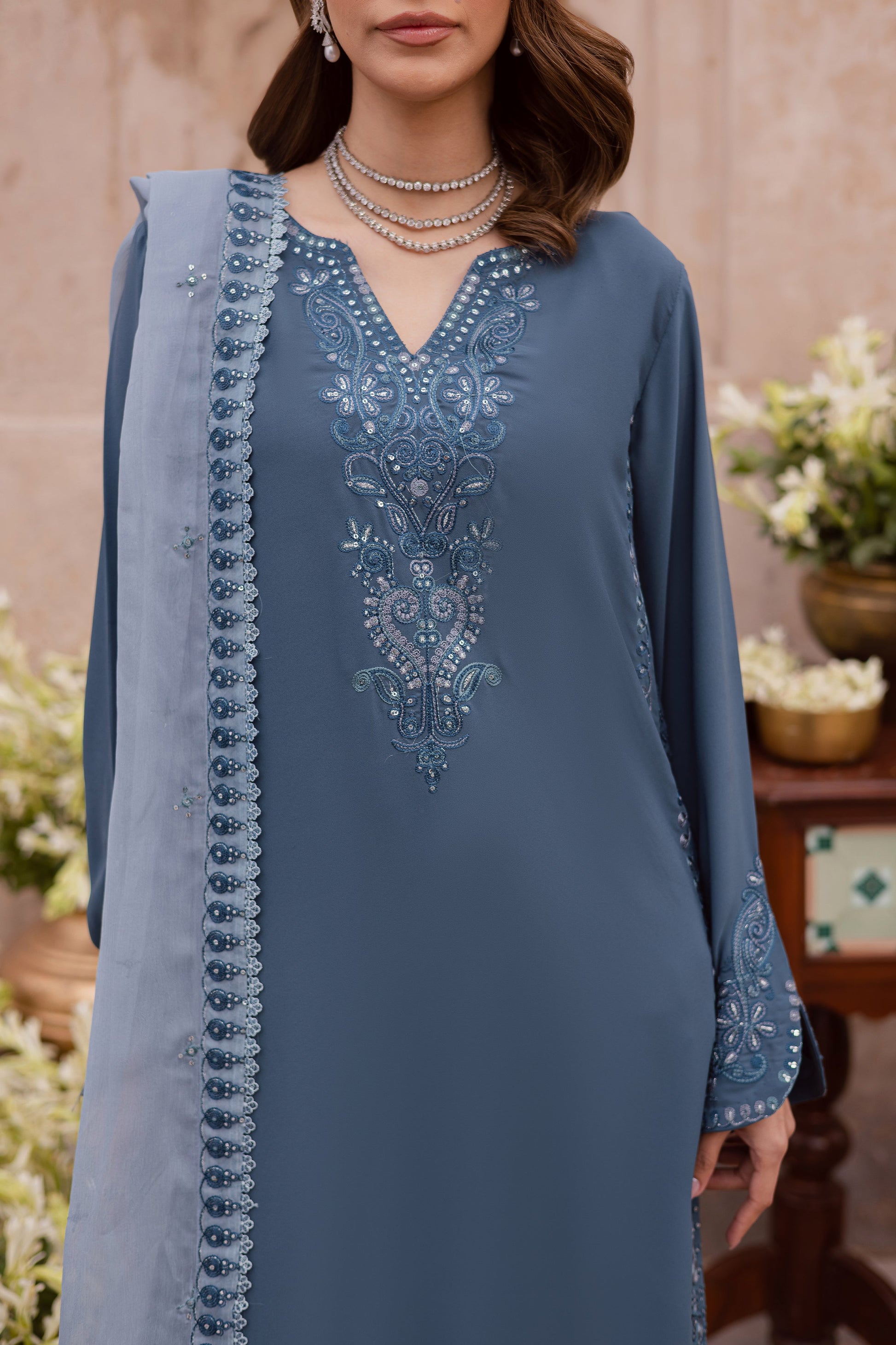 A contrasting crinkle dupatta completes the look, designed with embroidered borders on all four sides and an embroidered spread that adds depth and softness.