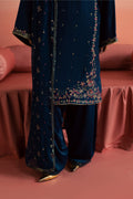 This three-piece silk ensemble features a composed embroidered shirt with sleeves, highlighted by an embroidered neckline and loose-fit embroidered sleeves. Lace finishing adds a refined and feminine touch to the silhouette.