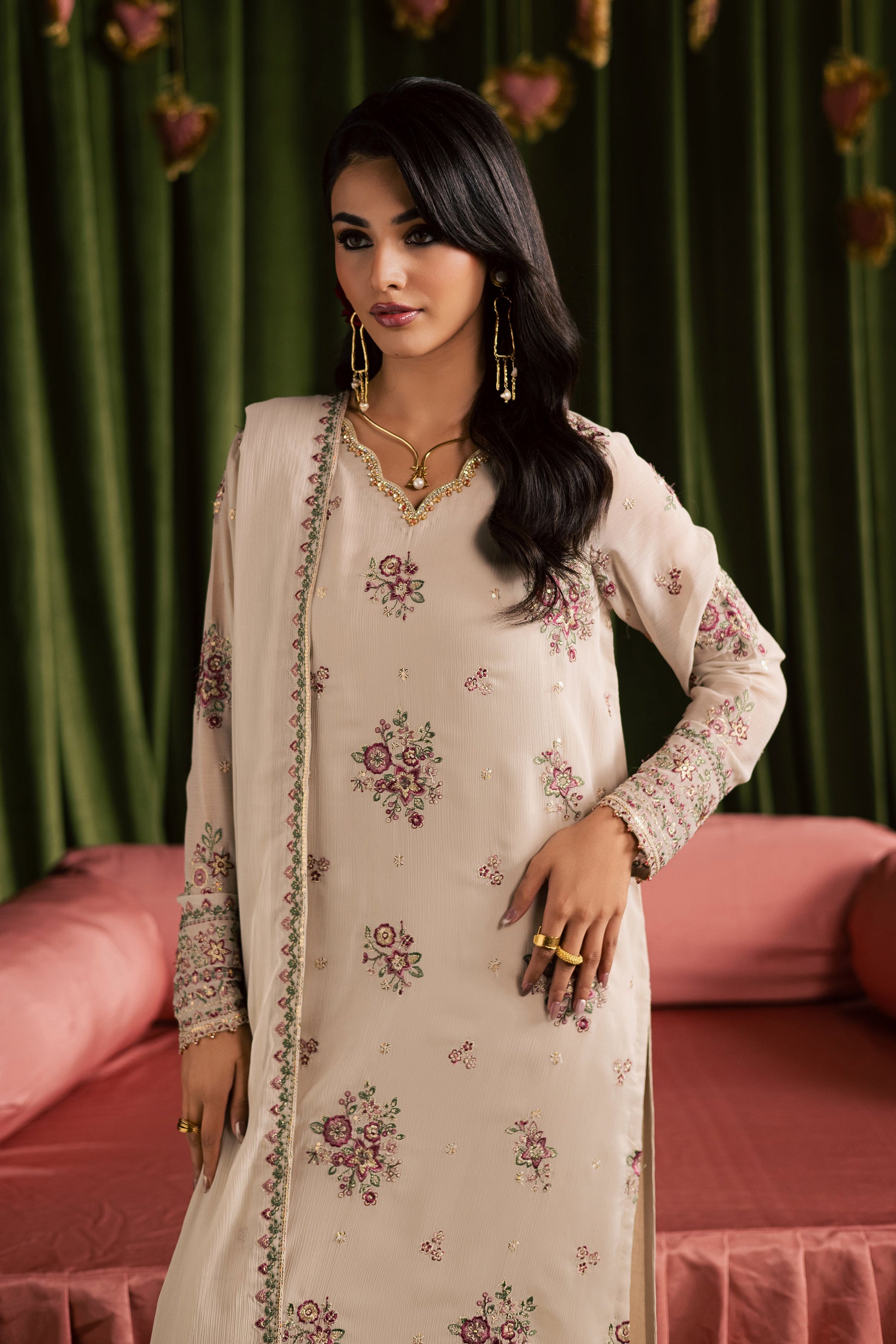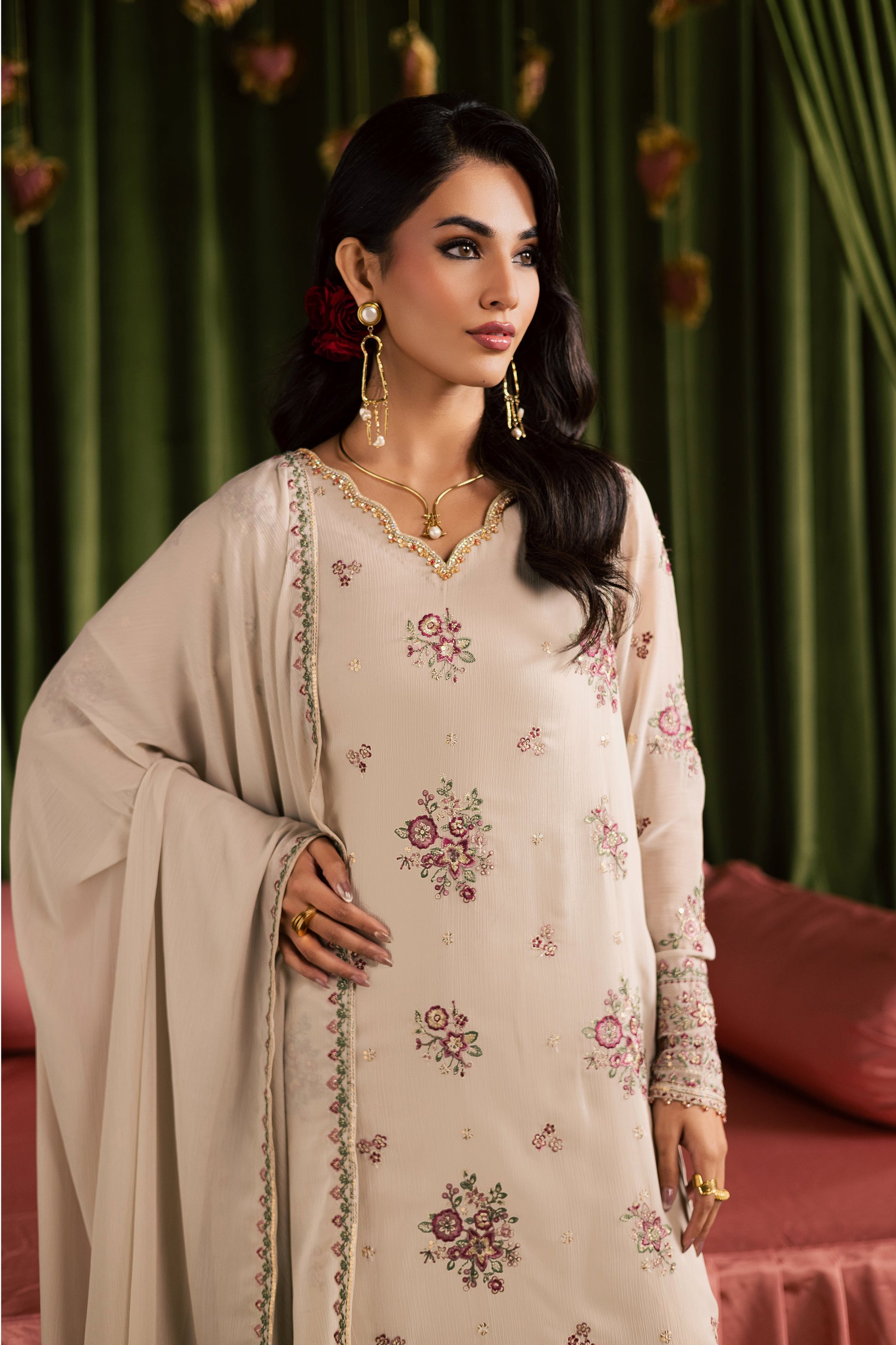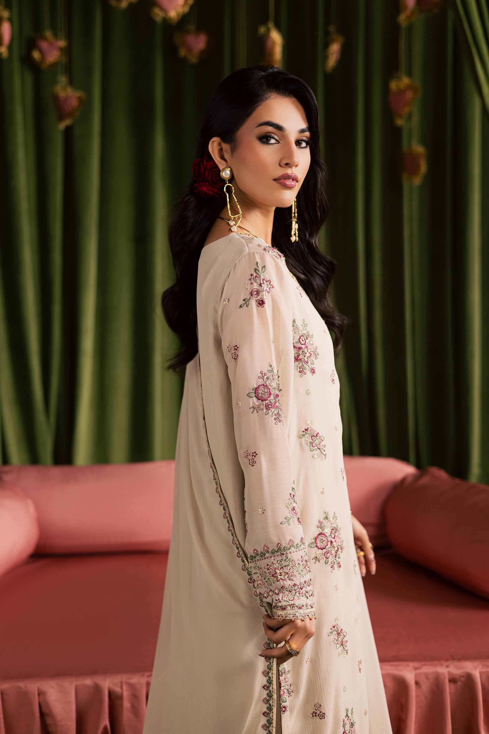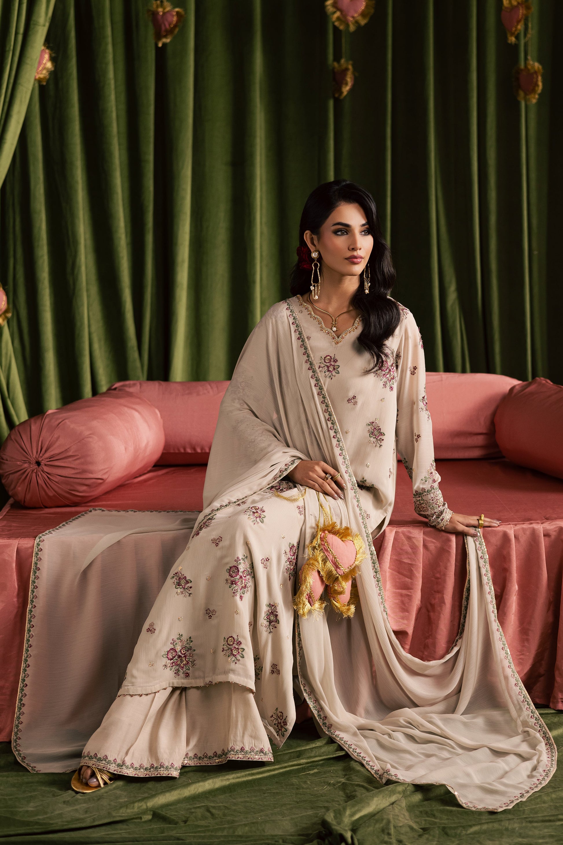 An embroidered crinkle dupatta completes the ensemble, adding texture and cohesion for refined Eid wear.