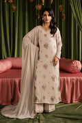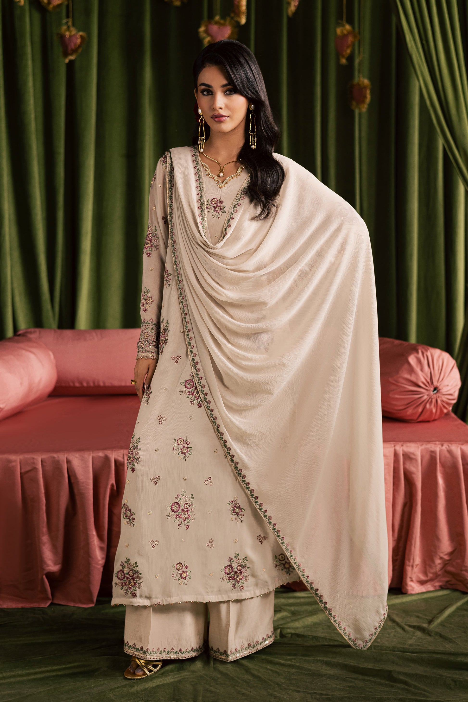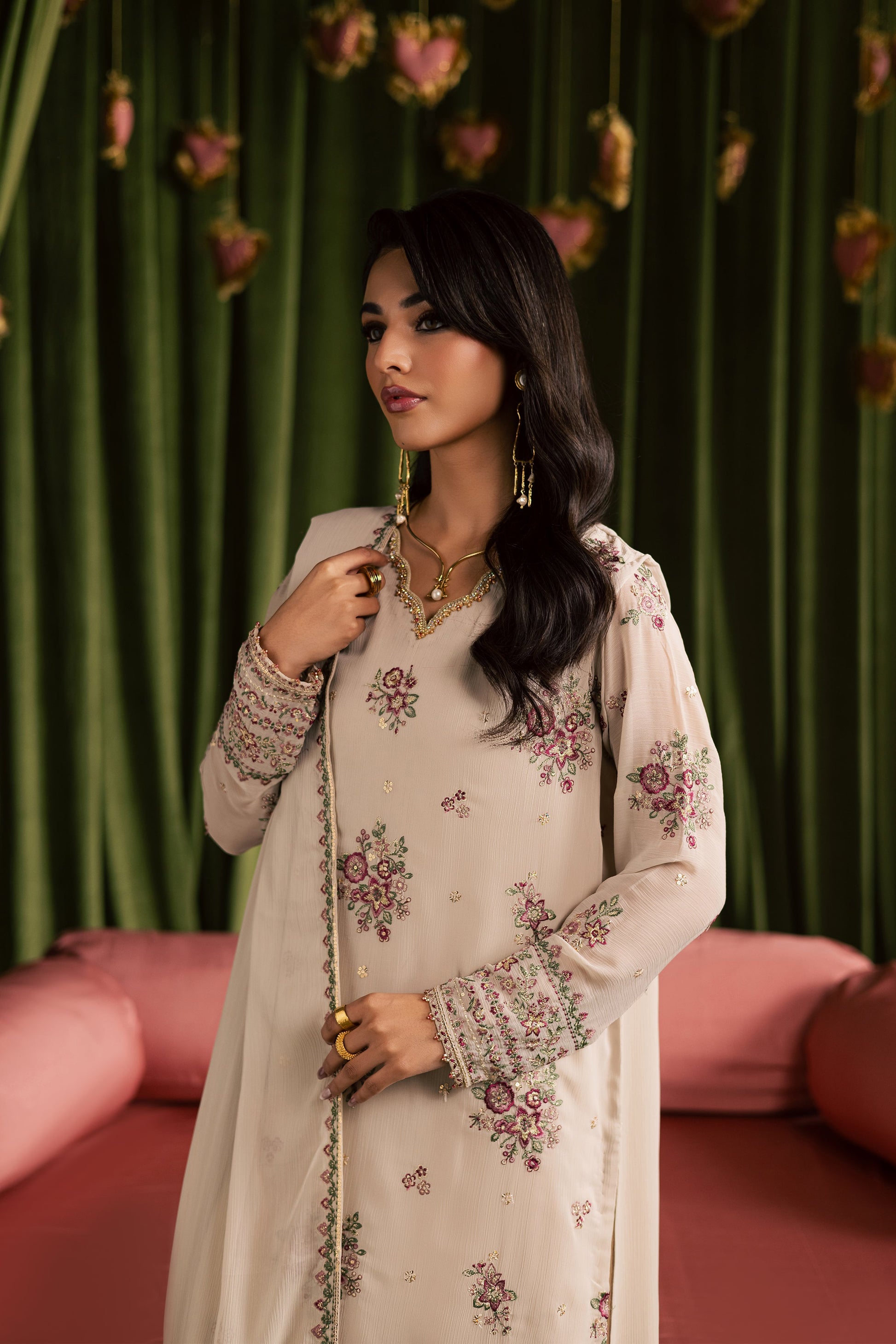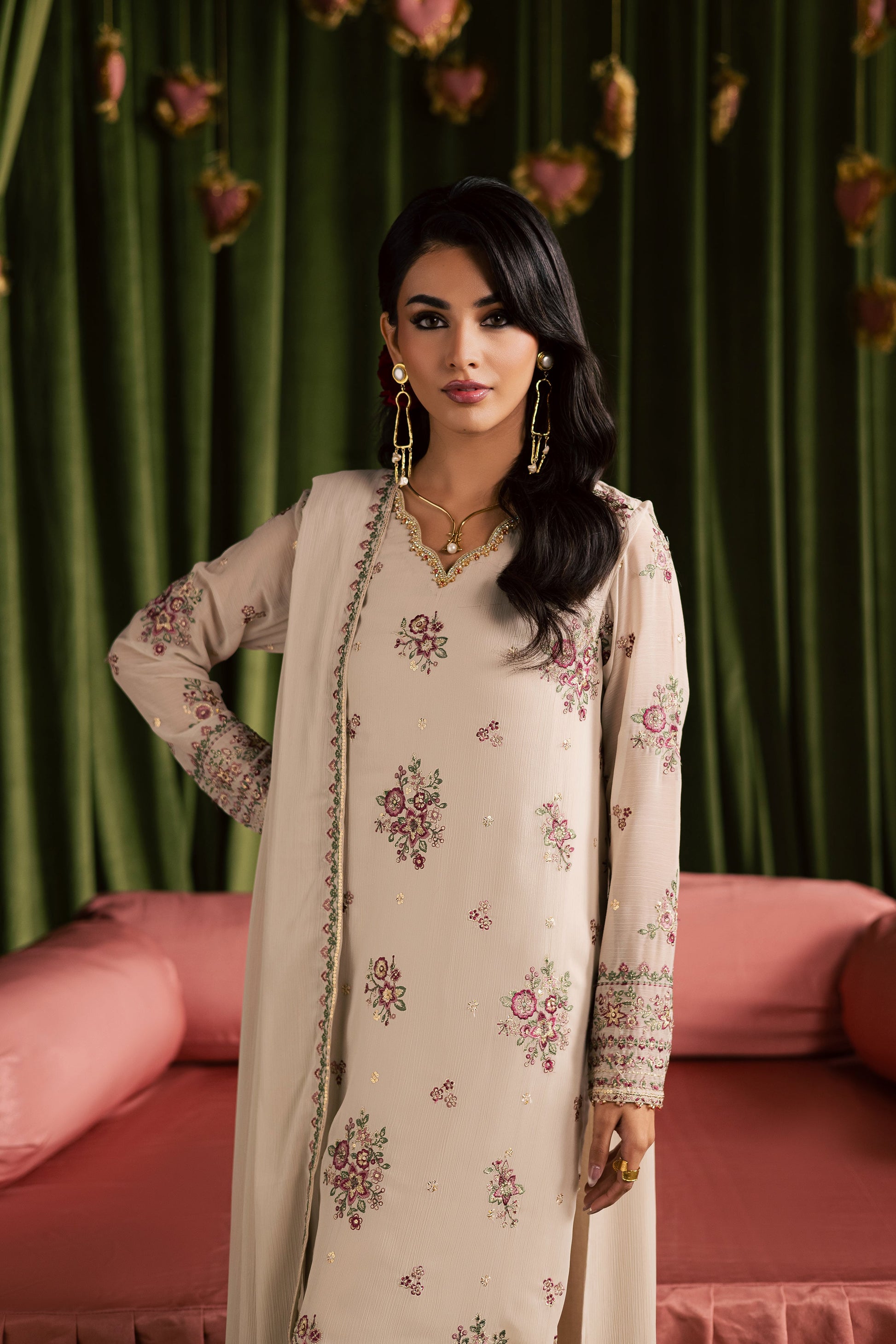 An embroidered crinkle dupatta completes the ensemble, adding texture and cohesion for refined Eid wear.