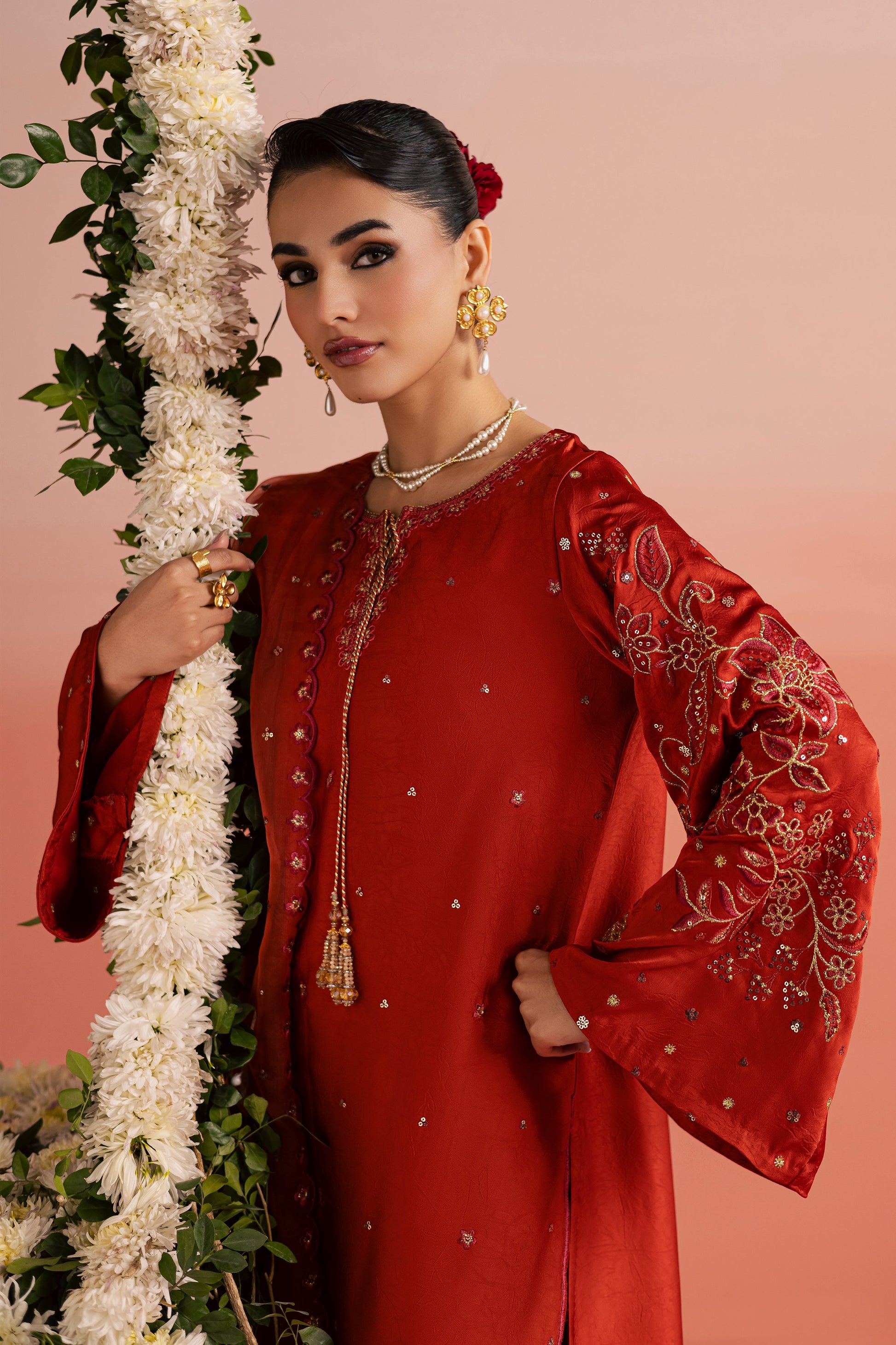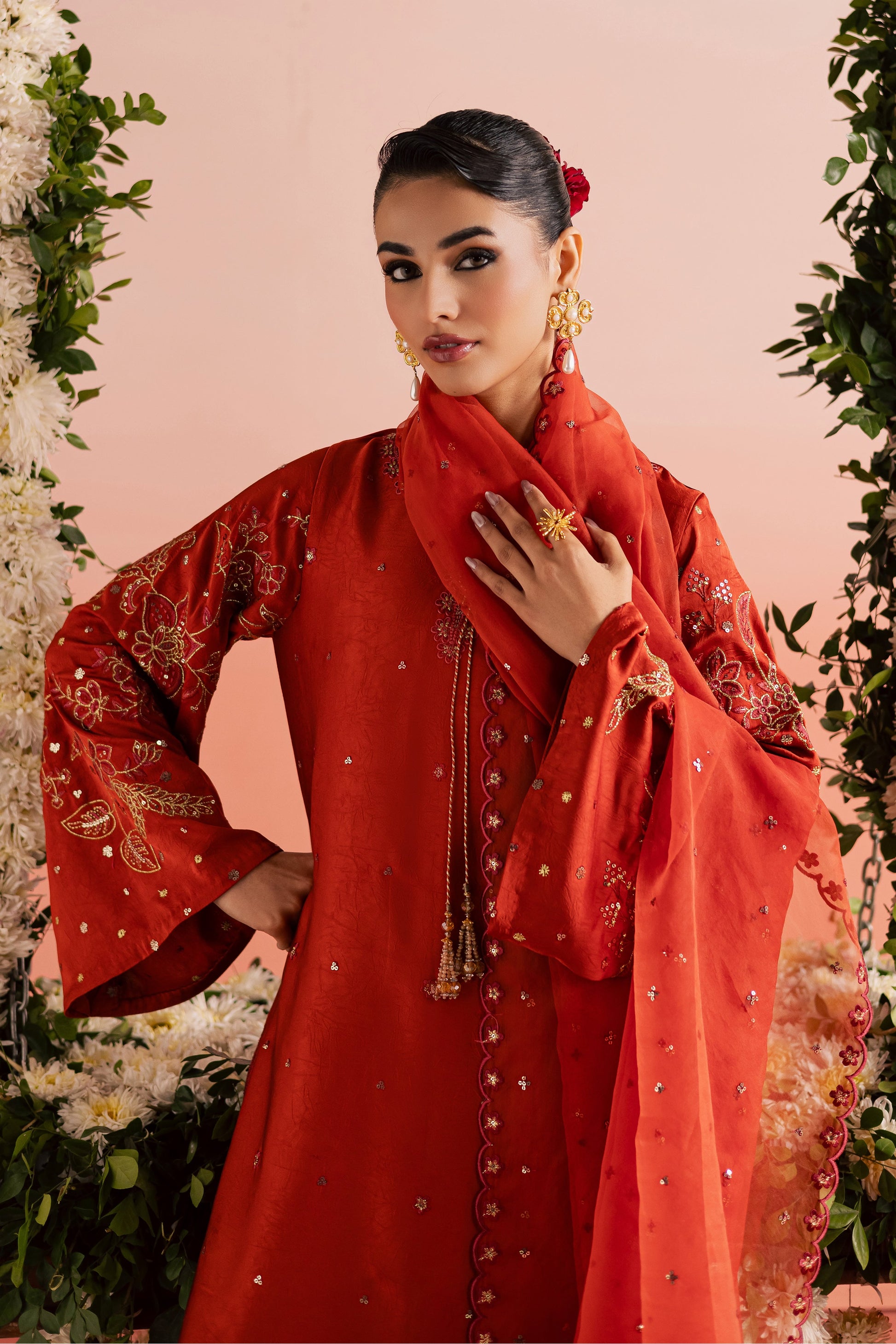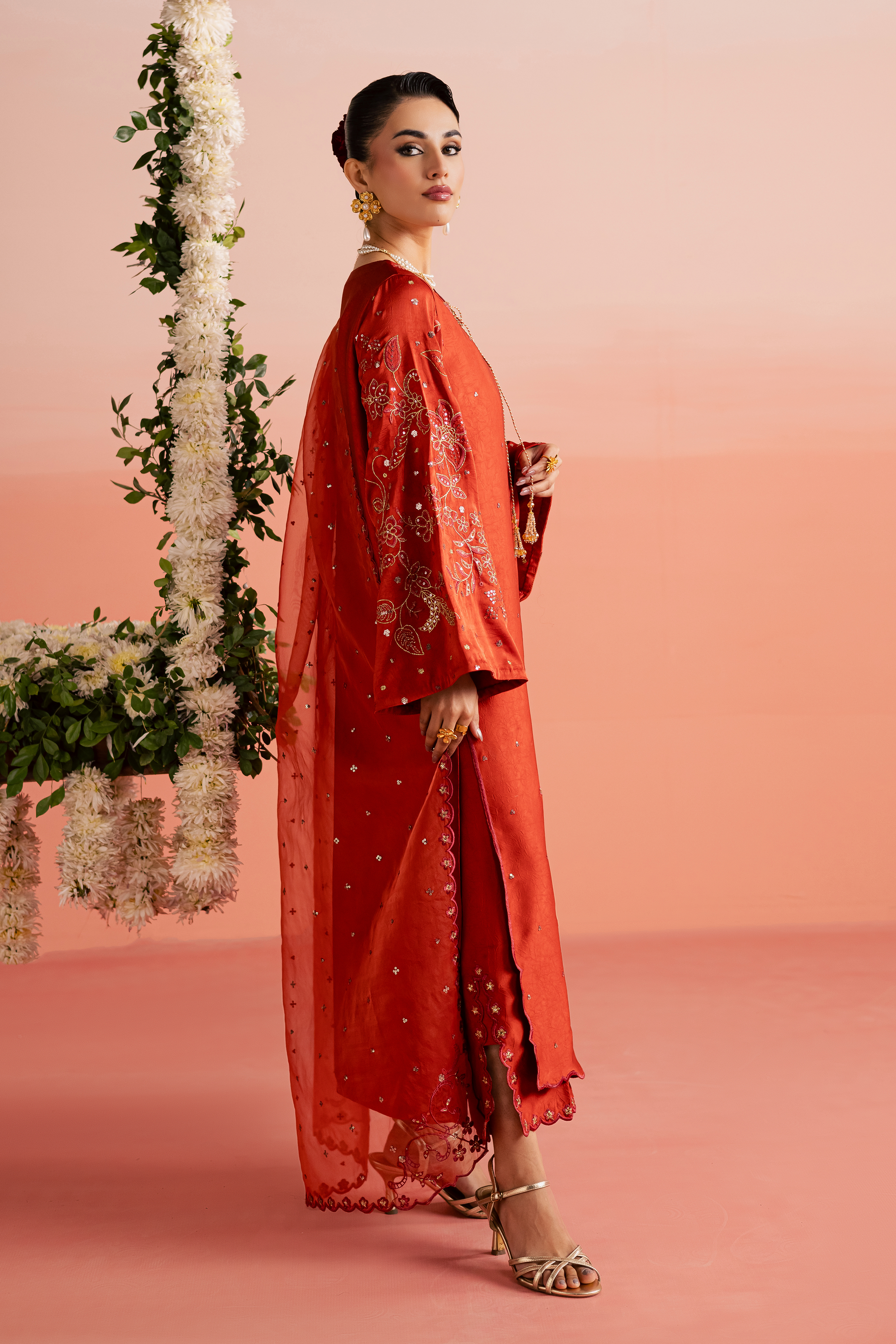 An organza dupatta completes the ensemble, featuring scalloped borders, an embroidered spread at the center, and a delicate embroidered motif on the pallu for a refined Eid finish.