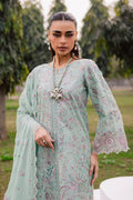 This three-piece Pima lawn Eid ensemble features a front-open fully composed embroidered shirt with sleeves, detailed with embroidered organza borders along the sleeves and hem. The silhouette is enhanced with delicate lace embellishments, creating a refined festive statement perfect for Eid celebrations.