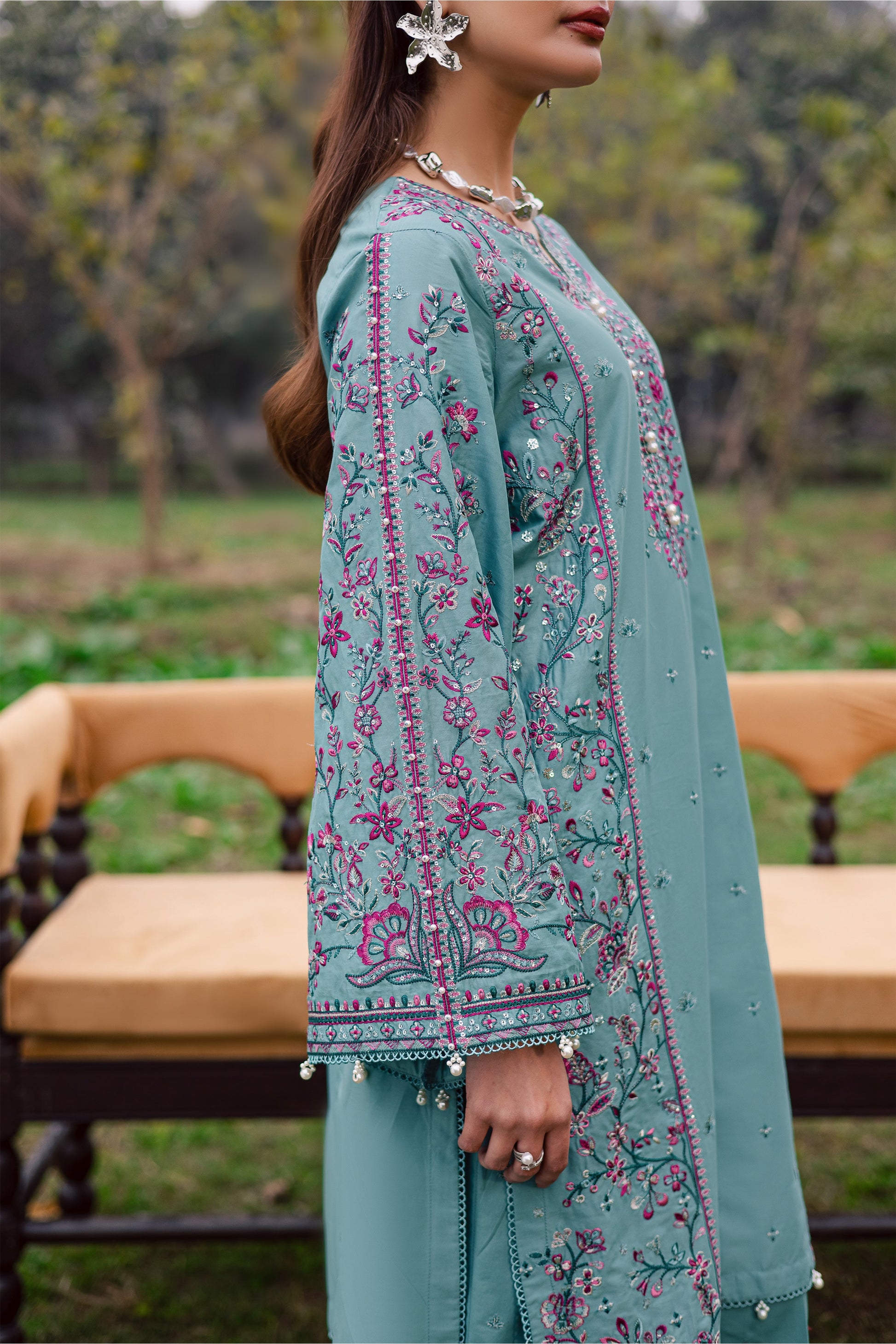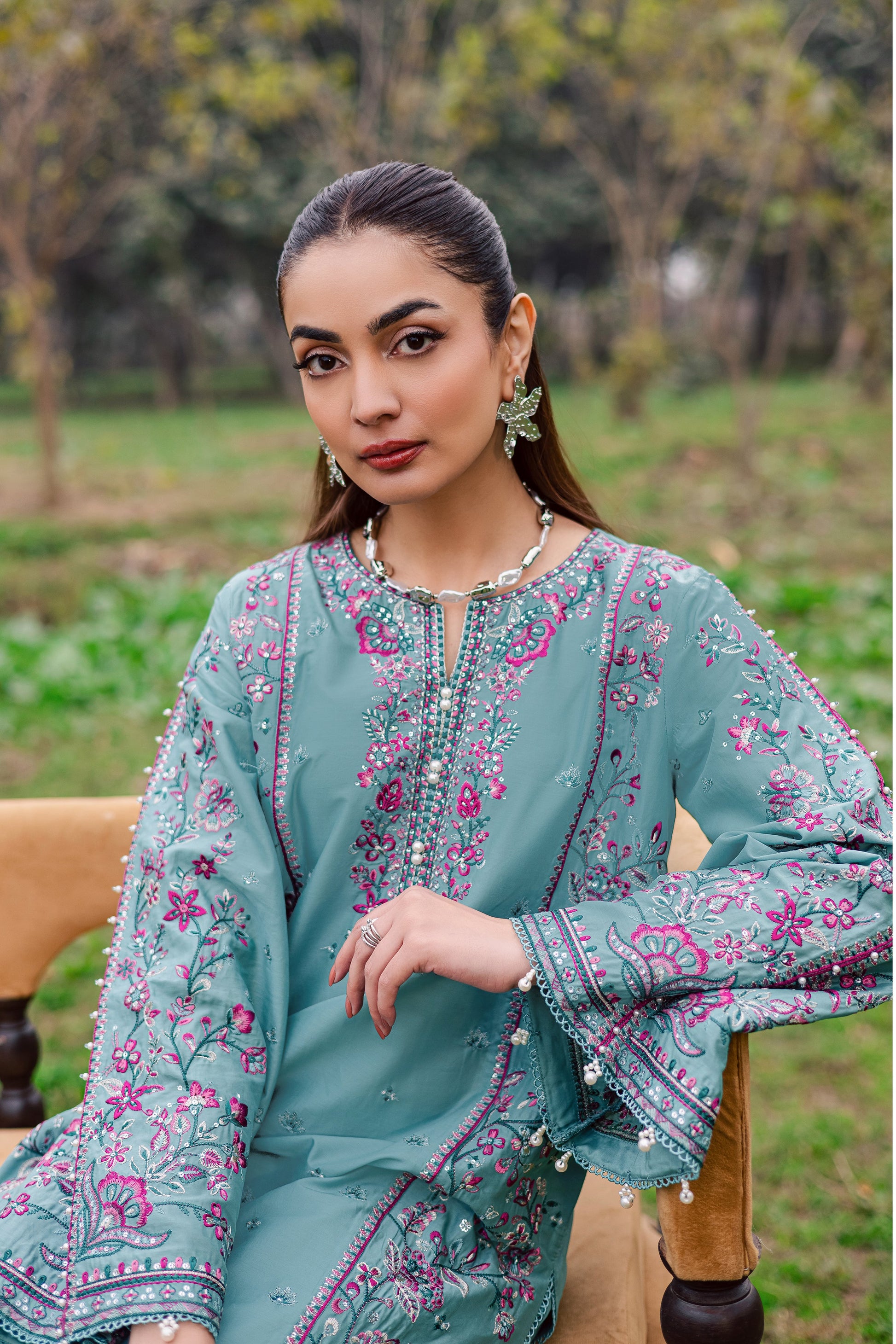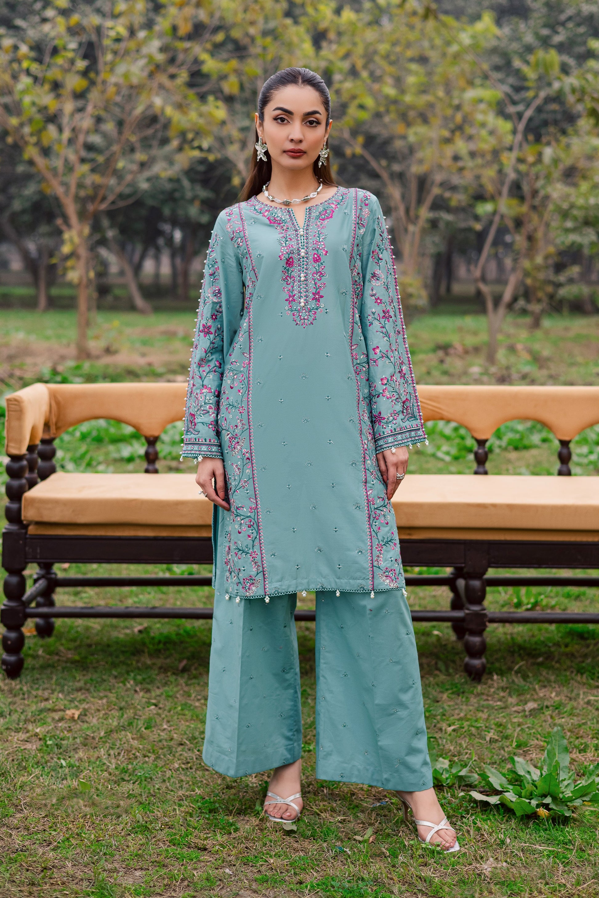 This two-piece Pima lawn Eid ensemble features a mid-length shirt with sleeves adorned in vibrant embroidery and pearl detailing at the neckline. The loose-fit sleeves are enhanced with pearl embellishments, creating a soft yet festive presence.