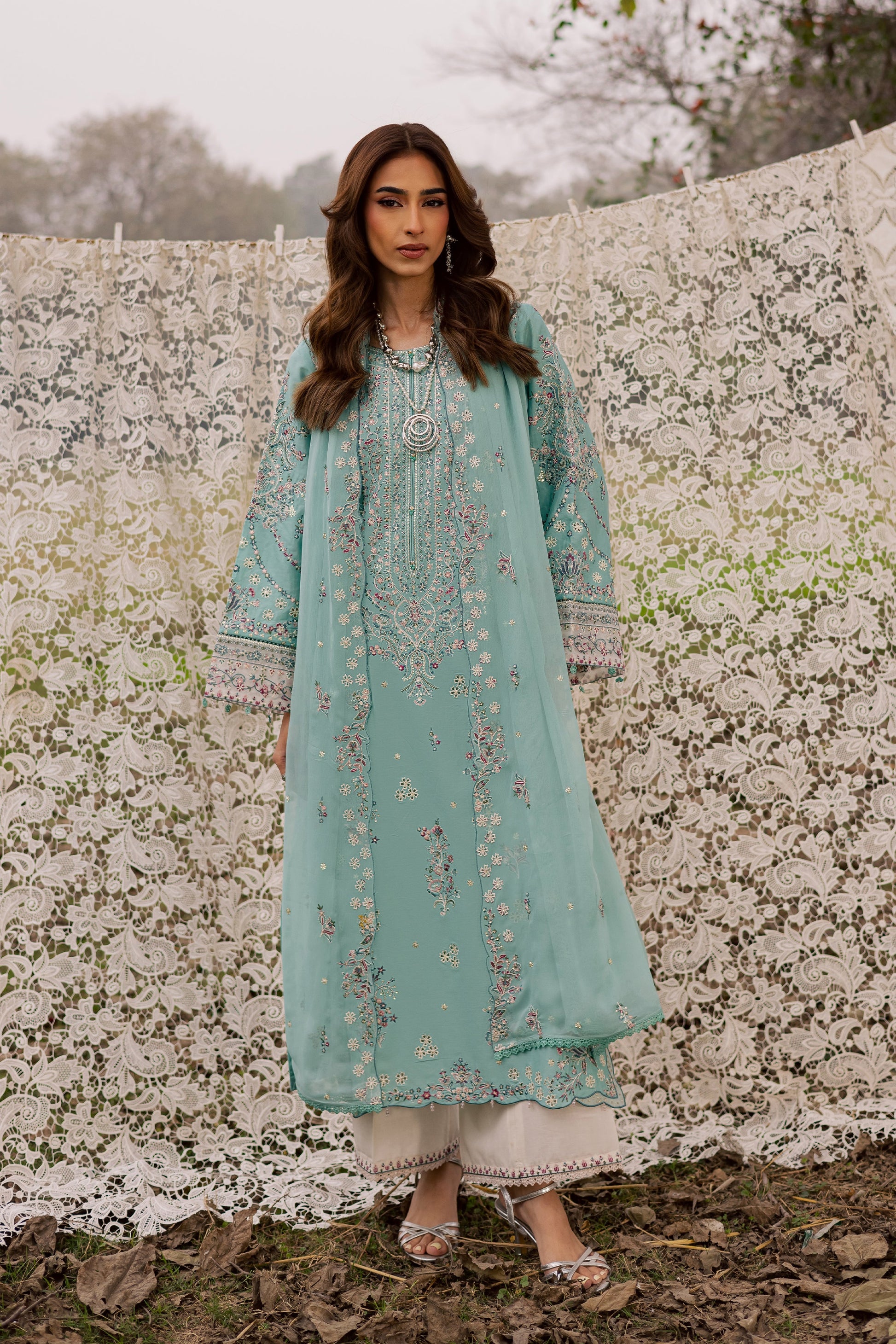 This opulent 3pc set in Pima lawn features a heavily embroidered long shirt with hand embellishments, organza detailing along the hem, and full-length flared sleeves finished with lace and embroidered organza borders. The neckline is delicately embellished, creating a luxurious and festive Eid look.