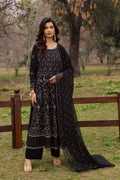 This exquisite 3pc set in Pima lawn features a panelled frock with seven fully composed embroidered panels on the front, enhanced with pearl embellishments along the hem. The fitted sleeves are fully embroidered and finished with pearls at the cuffs, creating a sophisticated and celebratory Eid silhouette.