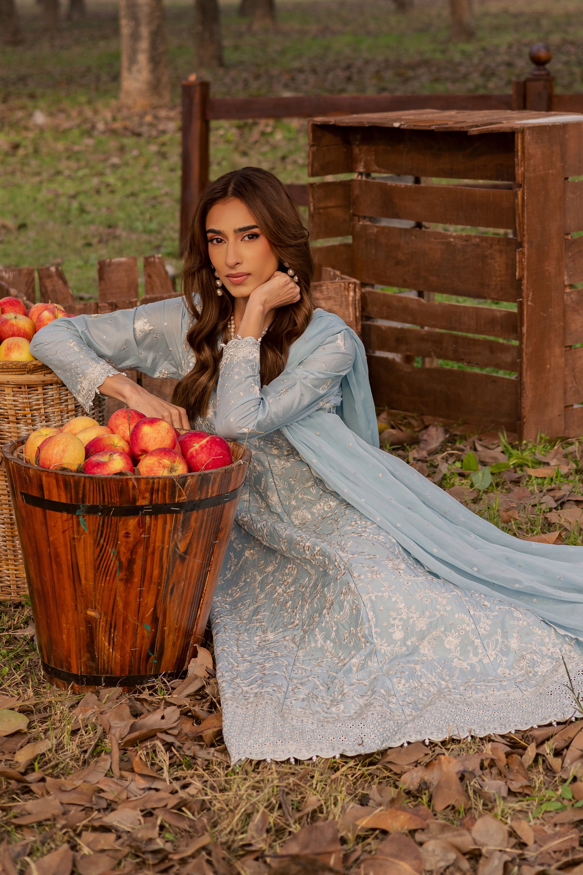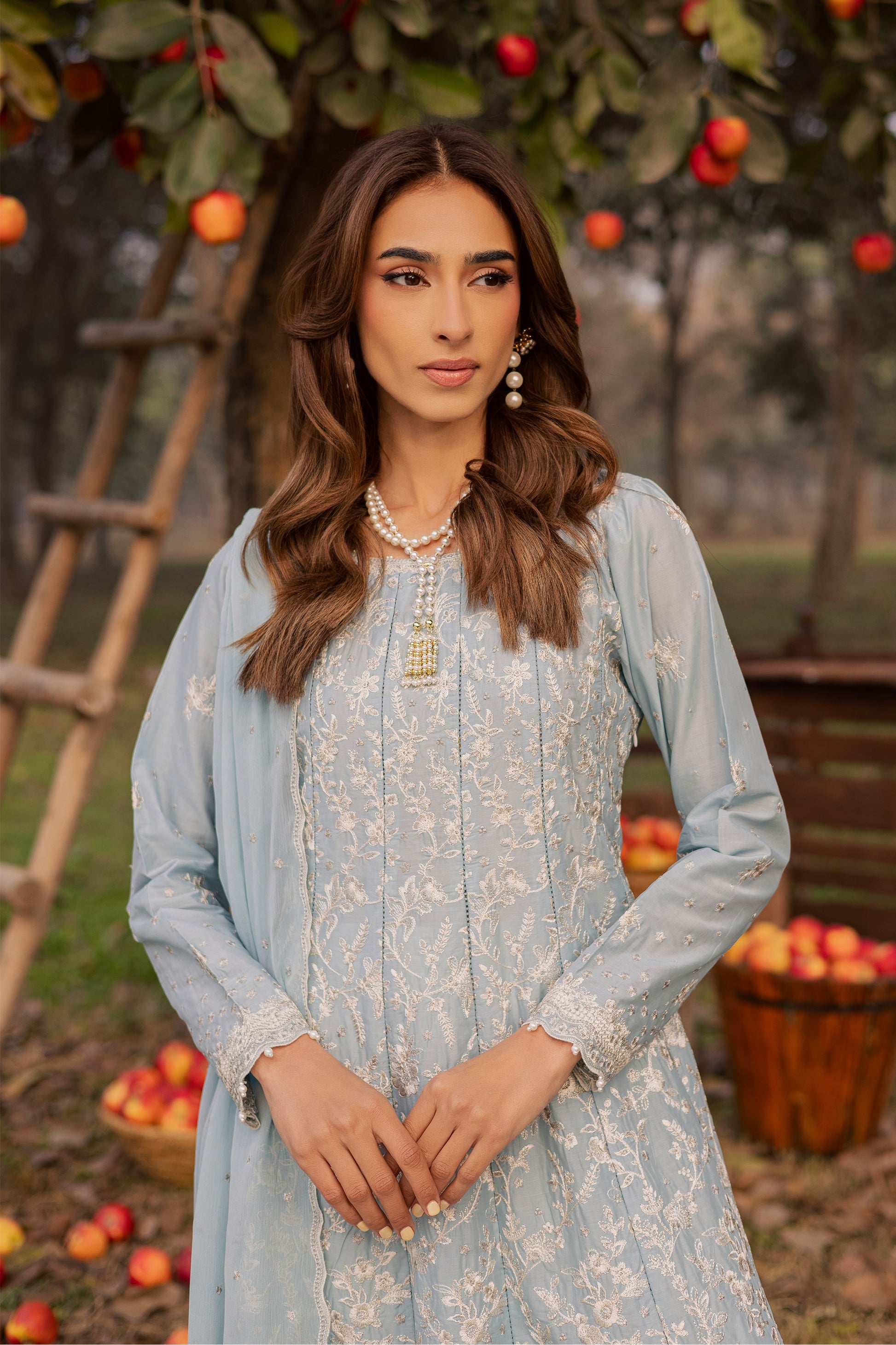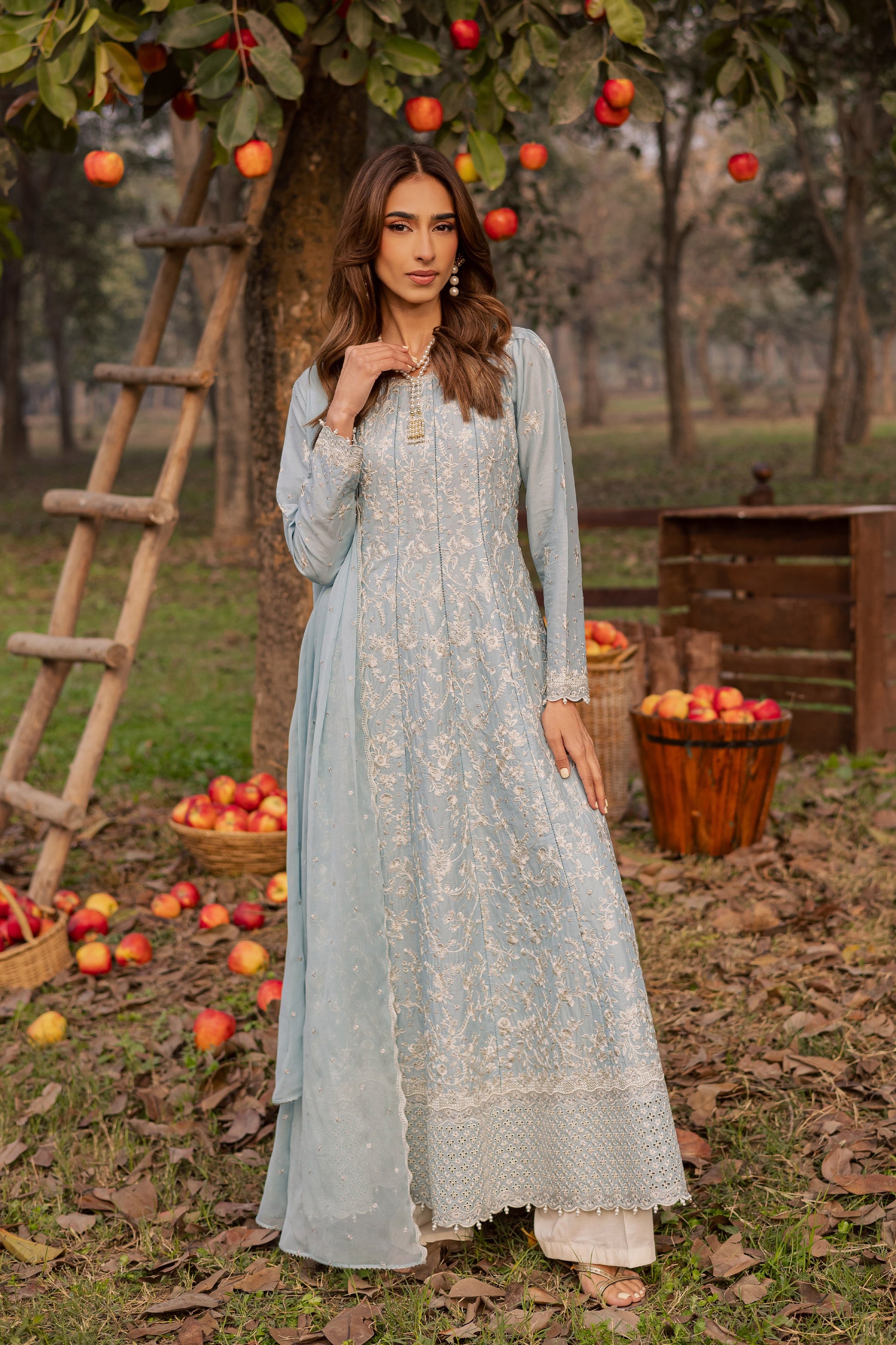 This exquisite 3pc set in Pima lawn features a sky blue paneled frock with seven fully composed embroidered panels, pearl embellishments at the hem, and fitted sleeves adorned with pearls. The intricate embroidery creates a sophisticated and celebratory Eid silhouette.
