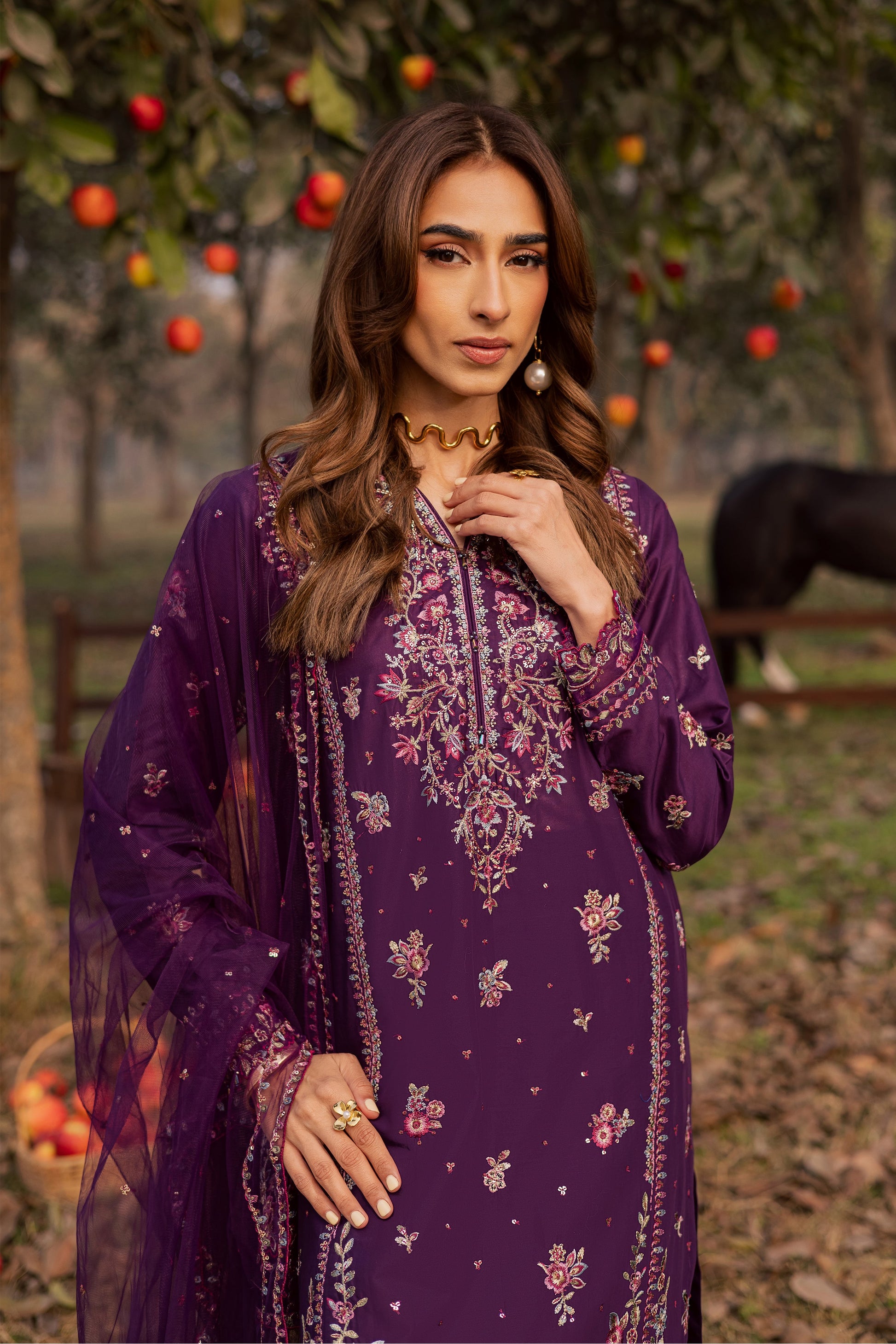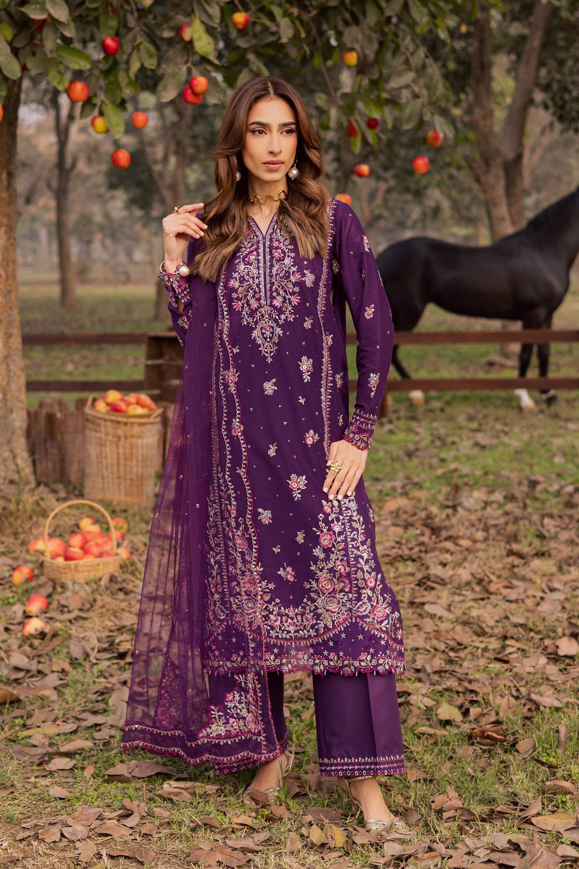 Three-paneled purple long shirt crafted from premium Pima lawn, featuring a heavily embroidered neckline and hem, complemented by an all-over embroidered spread across the shirt and sleeves. Scalloped organza detailing along the hem and sleeves is enhanced with crystal bead hangings, adding movement, dimension, and subtle sparkle.