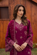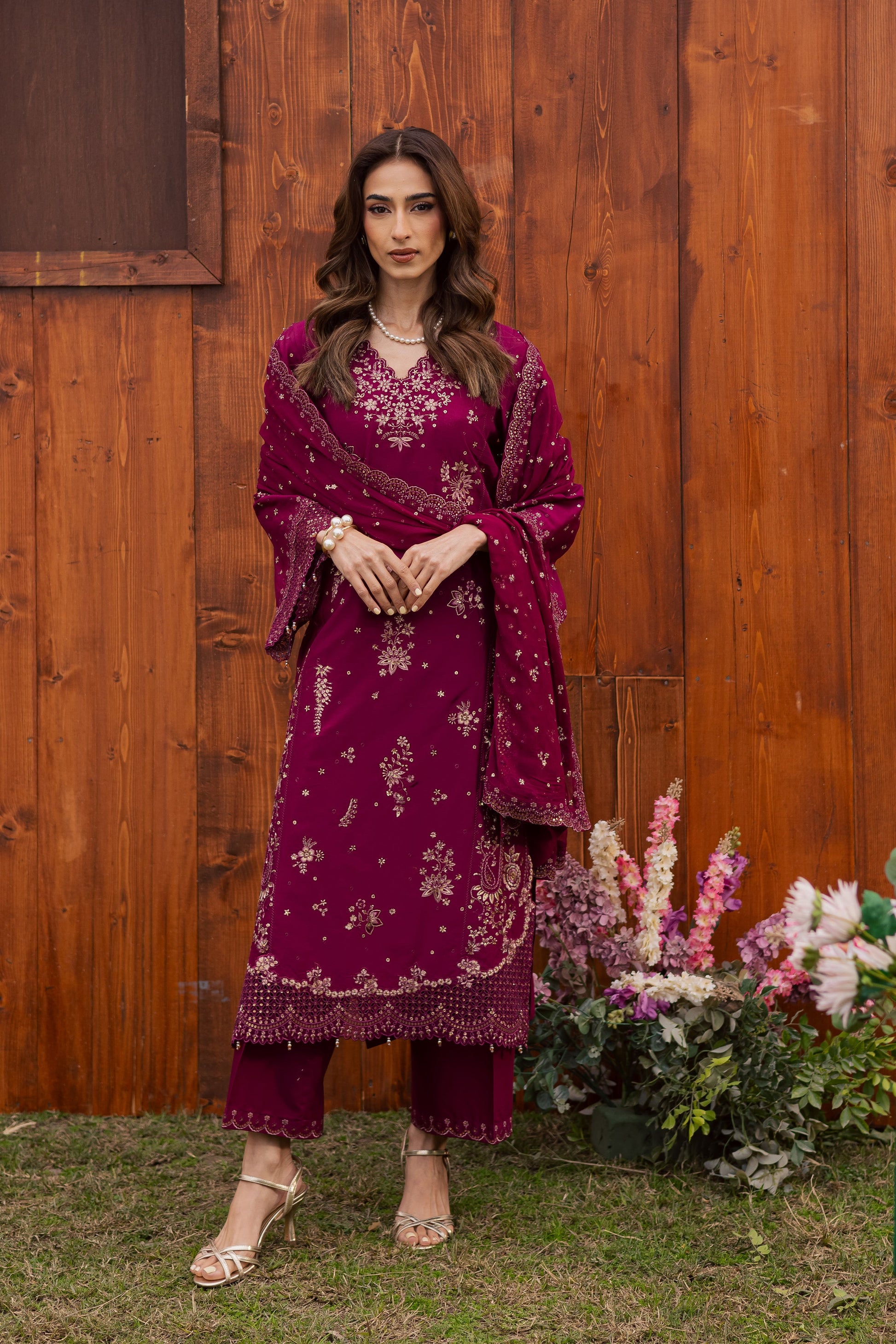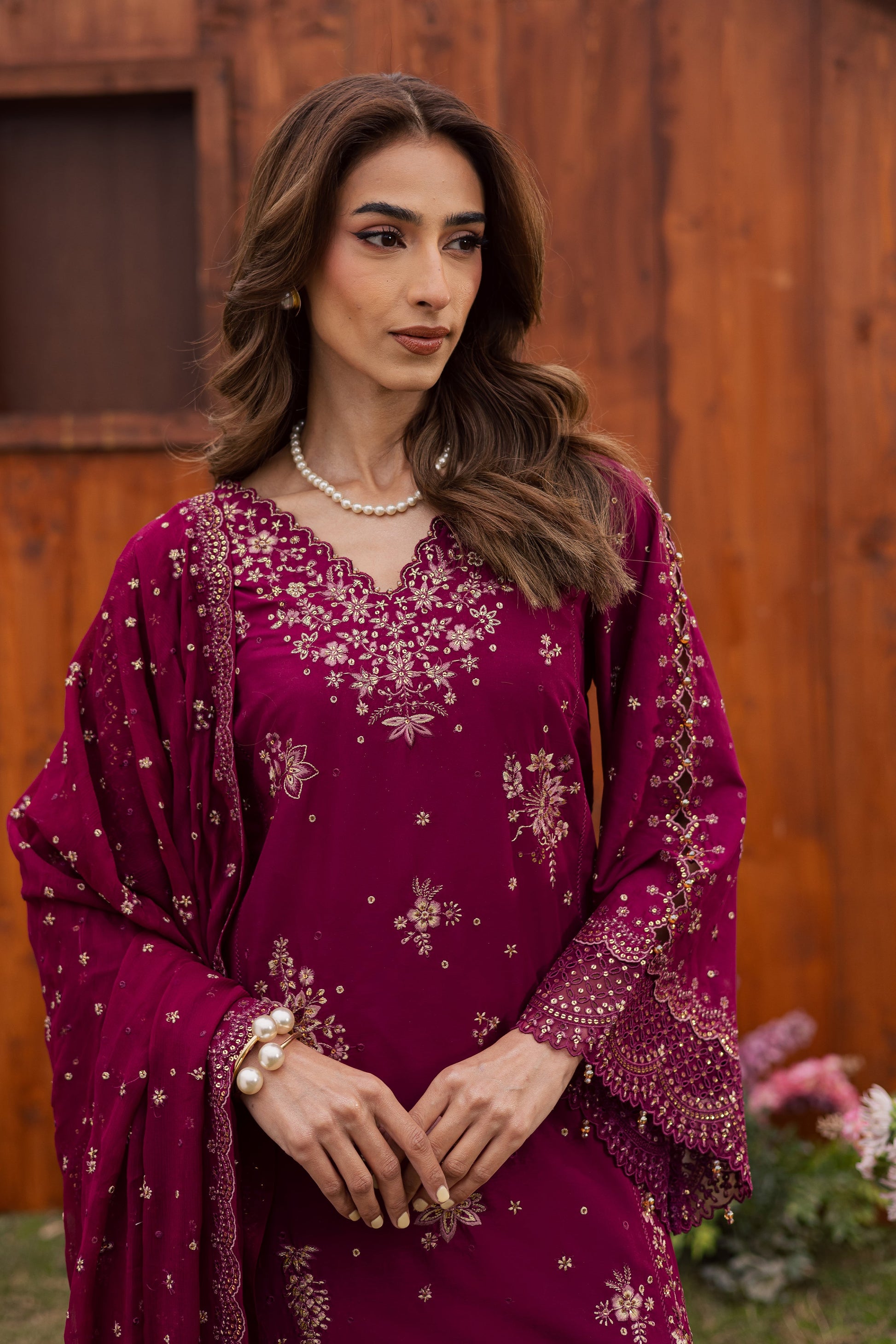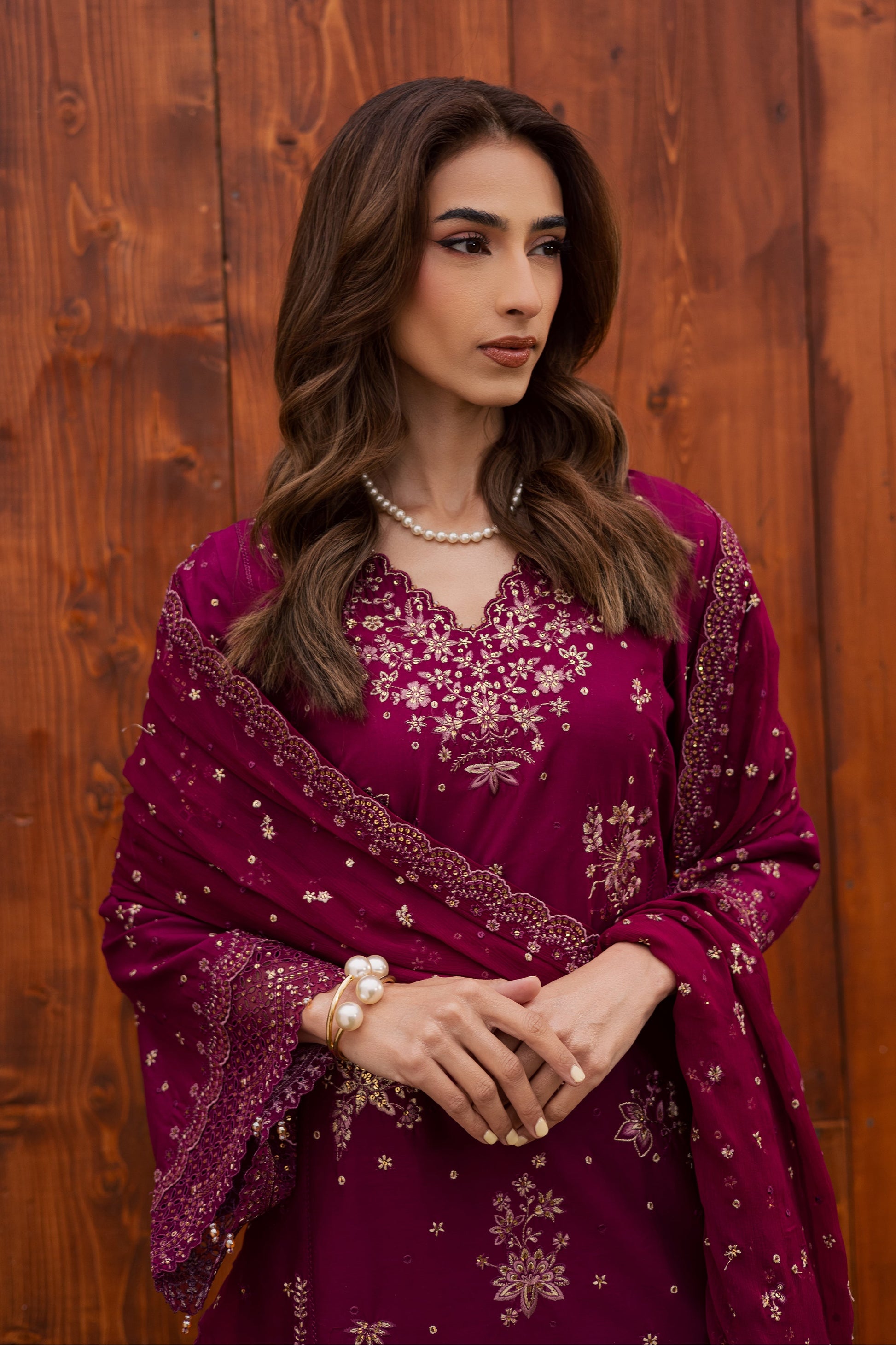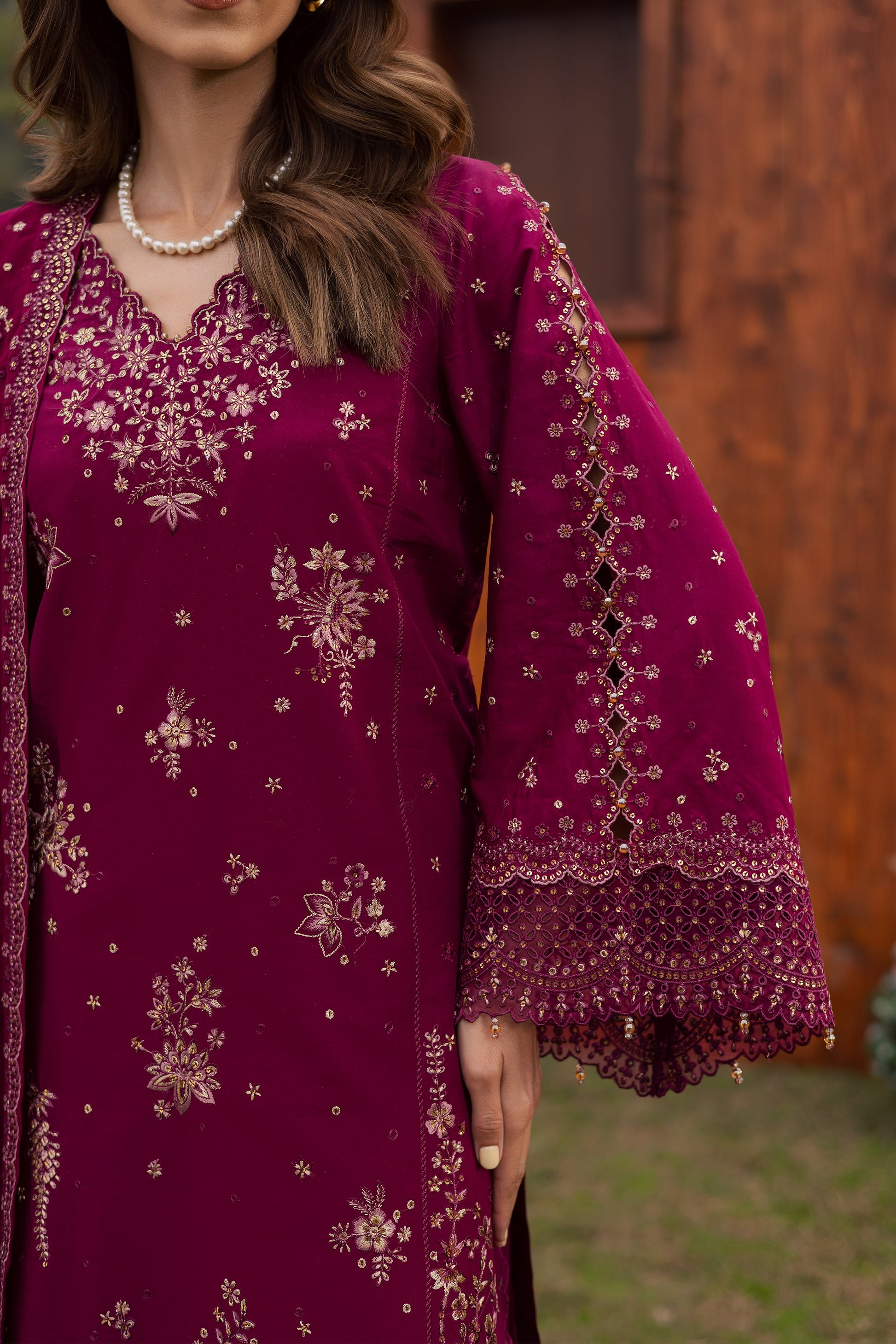 This festive 3pc set in premium Pima lawn features a long composed shirt with intricate embroidery, scallop-finished V-neckline, and organza embroidered borders at the hem. Flared sleeves are adorned with kavya-finished scallops and crystal accents, while embroidered organza trims at the cuffs enhance the luxurious Eid silhouette.