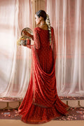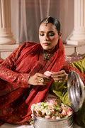 This 3-piece outfit blends rich craftsmanship with a touch of understated charm. The embroidered frock features direct adda work at the neckline, adding a refined hint of shimmer. The crinkle sleeves are embroidered and finished with a bordered hem and snap button detailing, while the frock's flare is panelled and embroidered with samosa lace and contrast borders that bring depth and texture to the design.