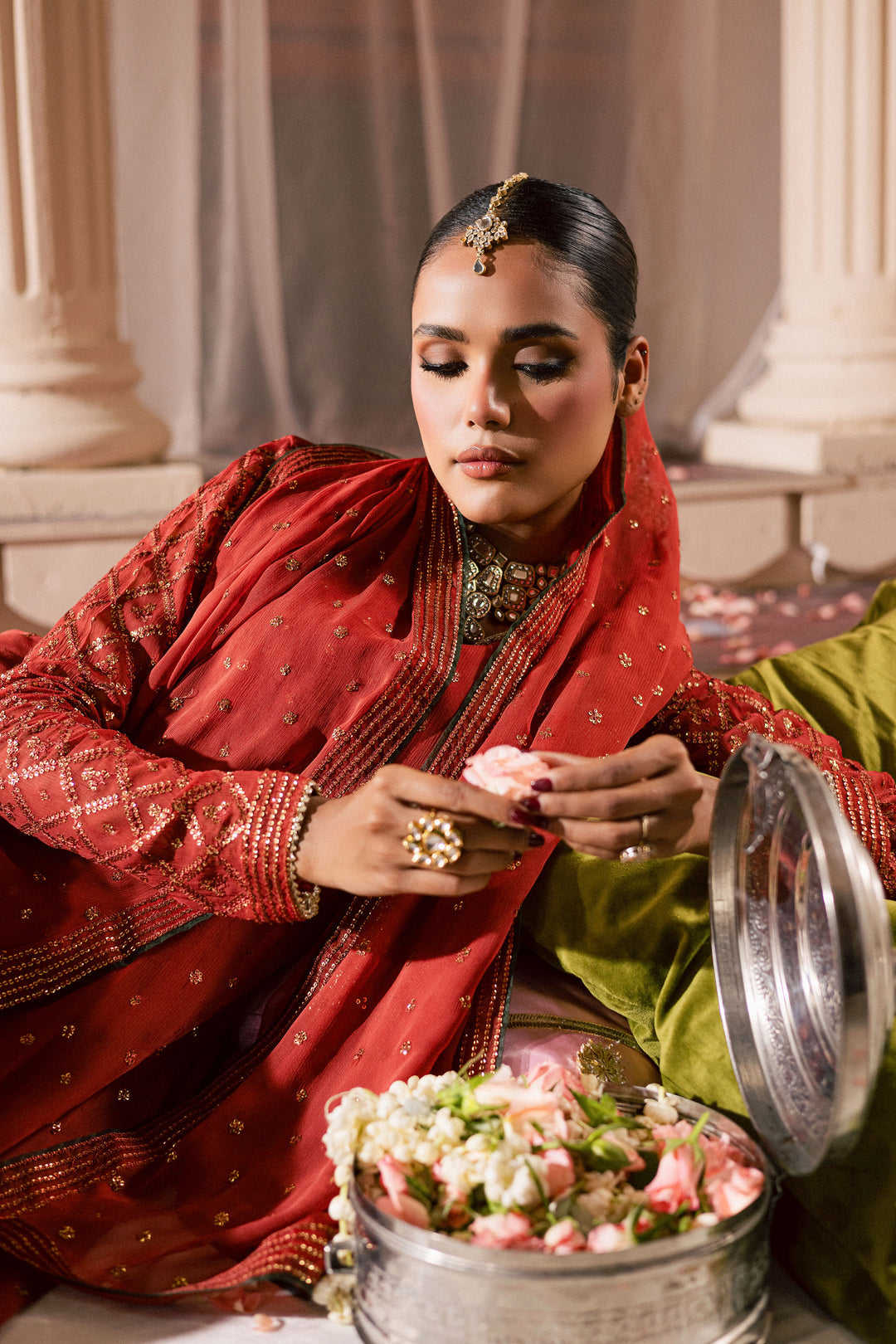 A crinkle dupatta completes the ensemble, featuring a delicate sequin spray at the centre and embroidered borders on all four sides. Finished with contrast piping, it adds a soft, graceful accent that ties the entire outfit together beautifully.