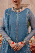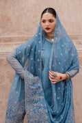 Make a graceful statement with Liyana, featuring a long stone blue front-open organza shirt adorned with intricate embroidery and sequin spread along the sides and borders. Crystals embellish the fitted sleeves, neckline, and hem, while crystal tassels add a delicate touch to the front opening.