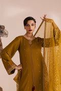 A formal embroidered dress with a textured georgette shirt in gold color featuring a direct adda neckline adorned with delicate tassels, paired with embroidered sleeves finished with borders at the hem. The look is elevated with samosa lace finishing, adding a graceful and traditional touch.